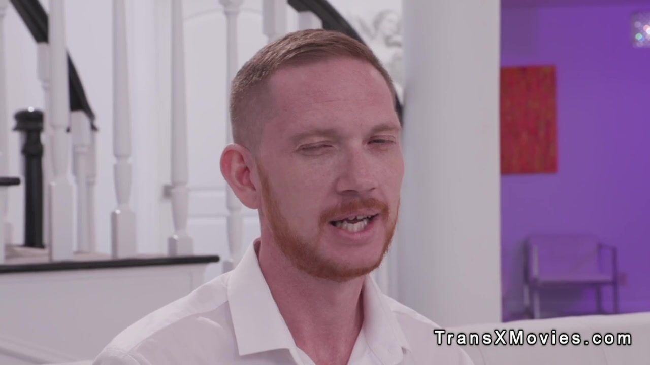 Blonde big tits tattooed trans model Gracie Jane teases and sucks big cock to Brody Kayman then he fucks her tight ass in reverse cowgirl position on the sofa in living room