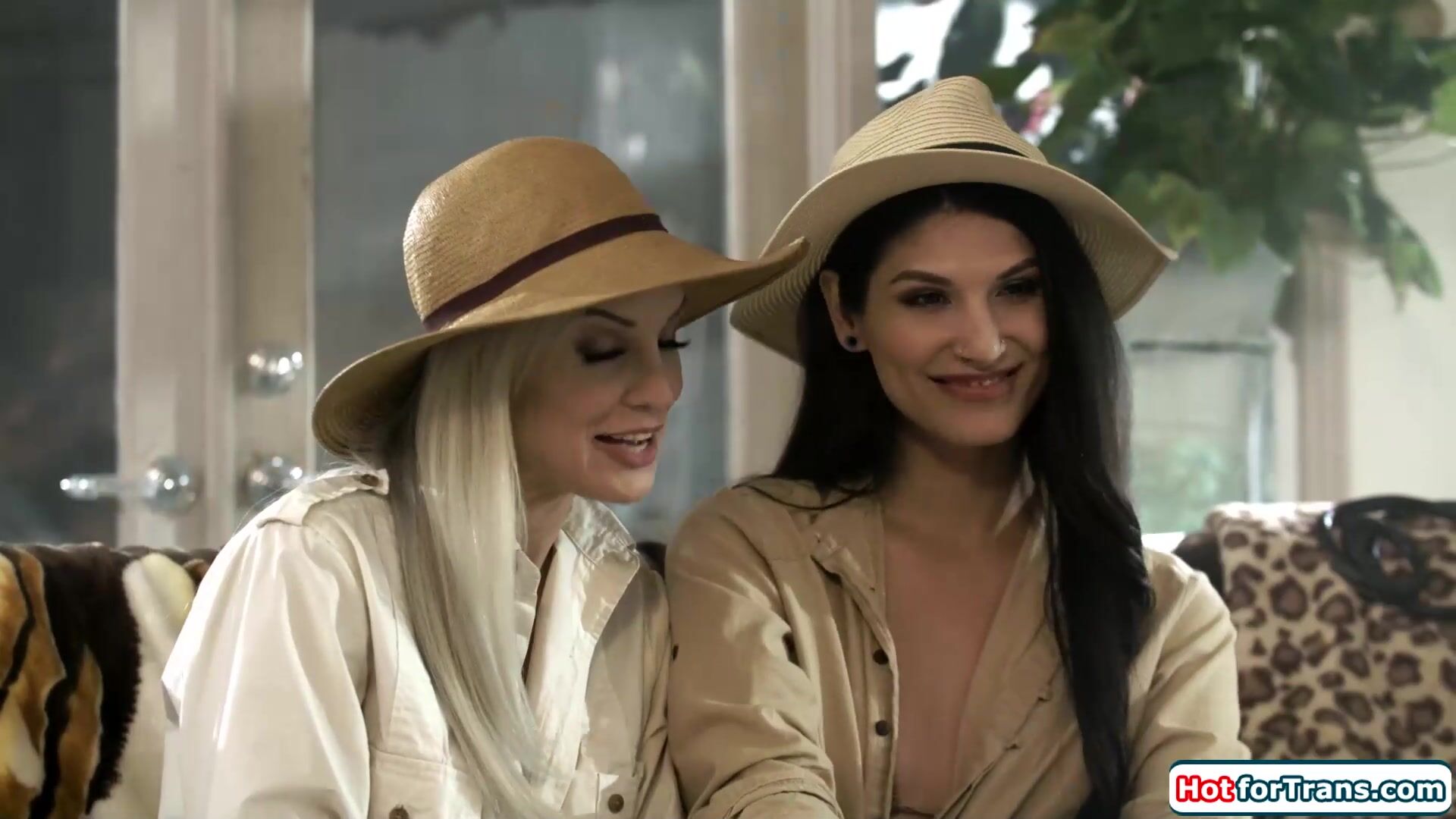 Busty milf Kenzie Taylor and her latin shemale bff Zariah Aura wrapped up their show and are horny.The small tits tgirl licks her gfs hairy pussy and is rimmed before getting her big tranny dick sucked off.The blonde cougar rides the brunette trans