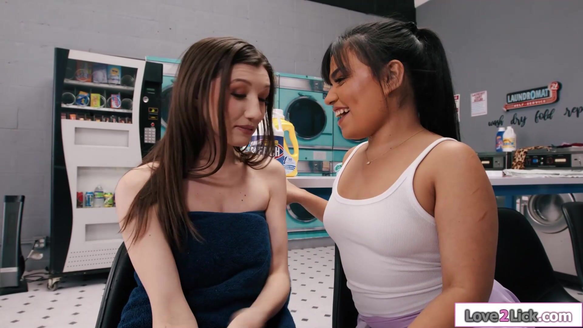 Lesbian Maya Woulfe gets seduced by her petite latin gf Summer Col.The latina wants to have sex at the laundromat.The small tits brunette kisses her and sucks on her small boobs.She licks her wet pussy and facesits her before scissor fucking her
