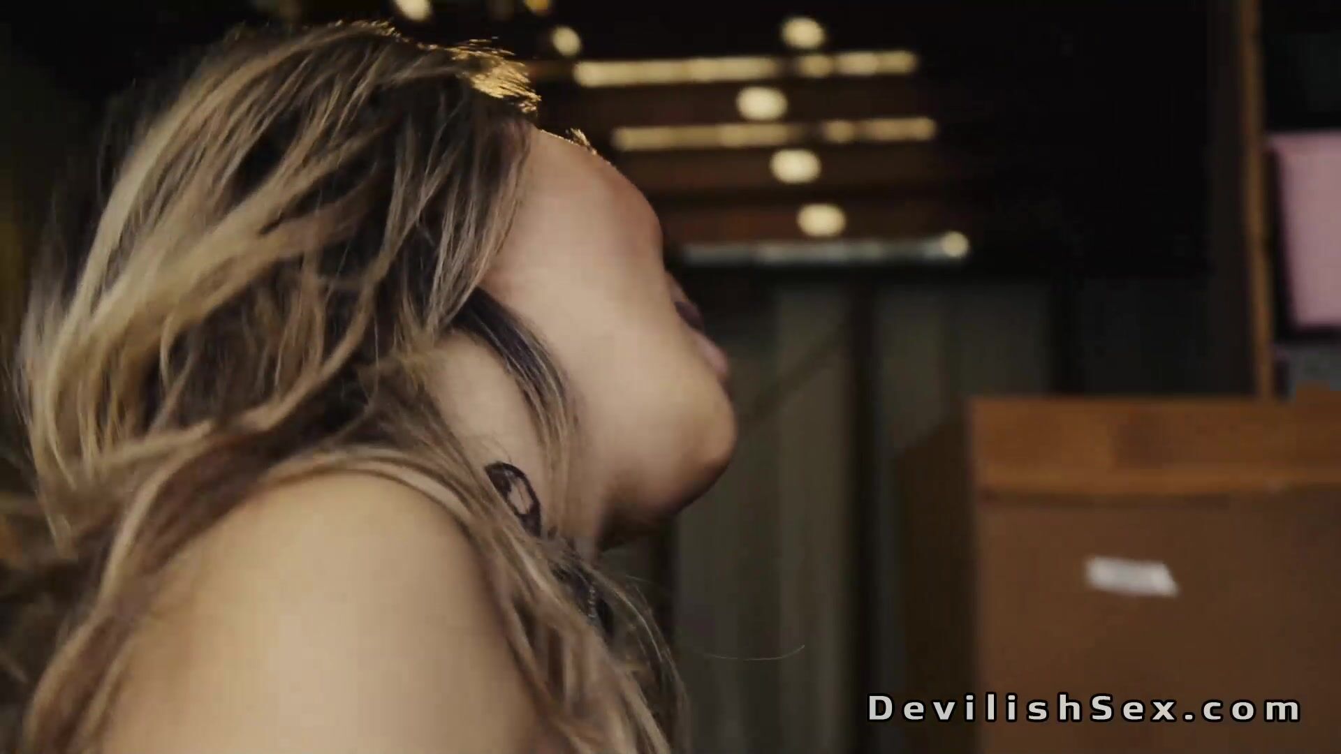 Busty Asian babe Nicole Doshi leans on ladder and gets rimjob from a biker David Lee then rides his big dick in chair in a various positions in a warehouse
