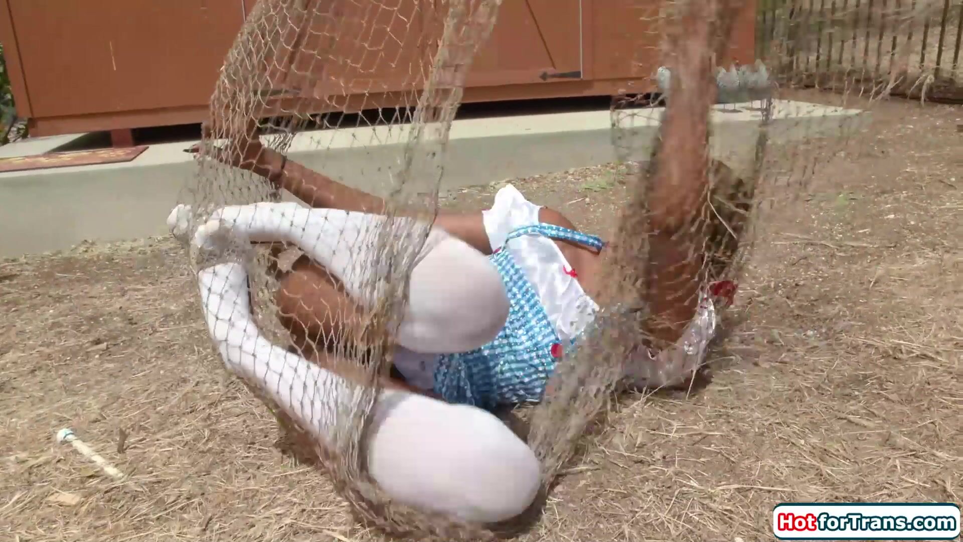 Busty shemale scarecrow Ariel Demure comes to life with a boner and seduces neighbor Destiny Mira into sex.Caught in a net trans Lola Morena joins in.The big tits latina tgirl fuck the ebony babe.Tranny Lola licks pussy while being anal barebacked