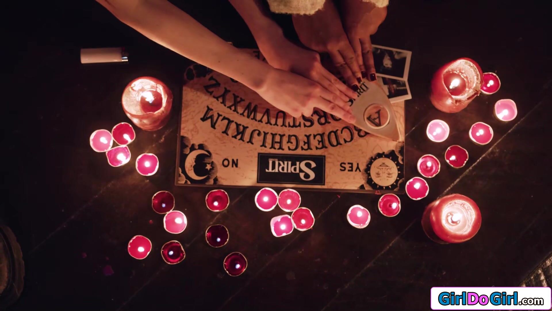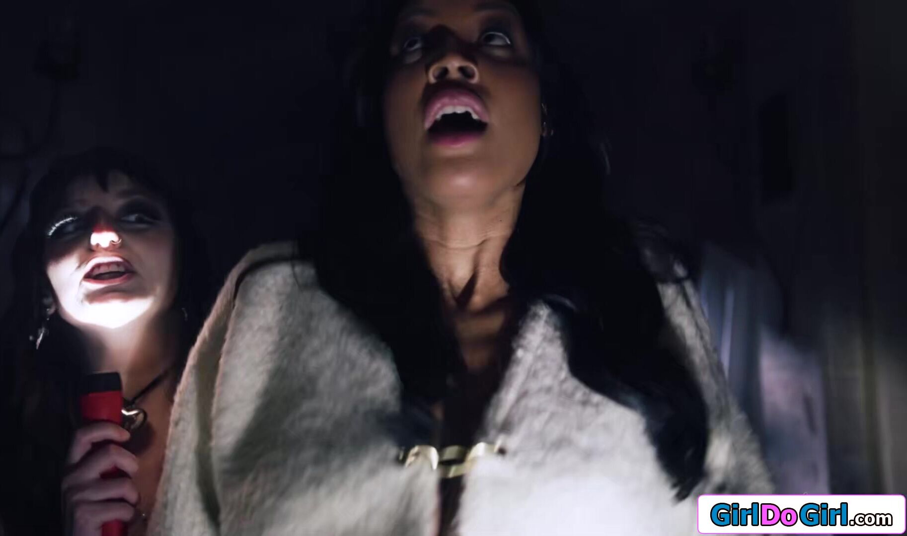 Lana Smalls and ebony bff August Skye summon busty ghost Penny Barber at their old haunt.The spirit needs lesbian sex to cross over.The small tits brunette rubs her pussy on the milfs nipple and facesits.She sucks her feet while the black babe licks