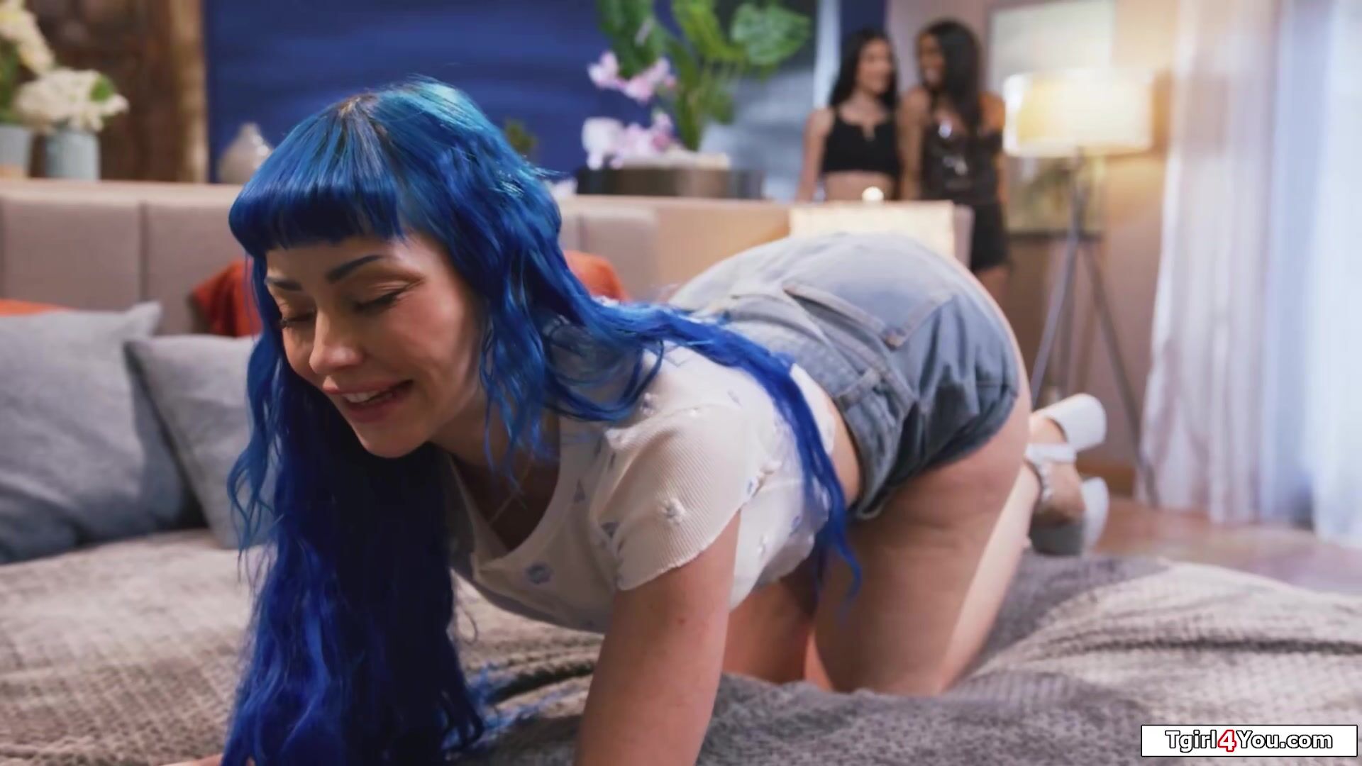 Description: Latina shemale Zariah Aura and busty black tranny Leilani Li respond to their busty friend Jewelz Blu her sex add.The blue haired babe is ass fingered and facefucked while analed by the ebony tgirl.The transsexuals dp and double vagina fuck her
