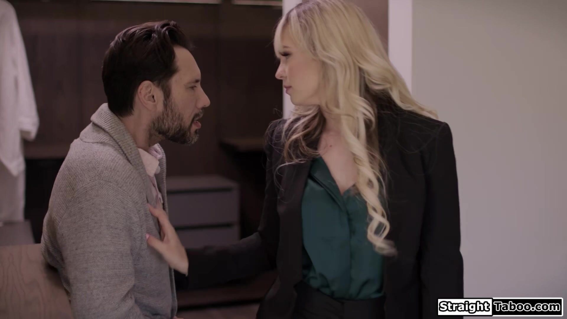 Horny realtor Lilly Bell locks clients wife in so she can suck off his dick.The blonde deepthroats him almost to the end before freeing his wife again.The petite babe is not finished and lets him eat her ass and hairy pussy before getting fucked