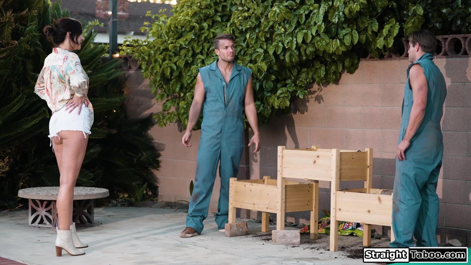 Former sex addict Charlotte Sins flirts with two workers and invites them in.They start to kiss the busty tattooed babe suck her titties.The big boobs brunette get oral while deepthroating before shes fucked.One fingers her pussy until she squirts