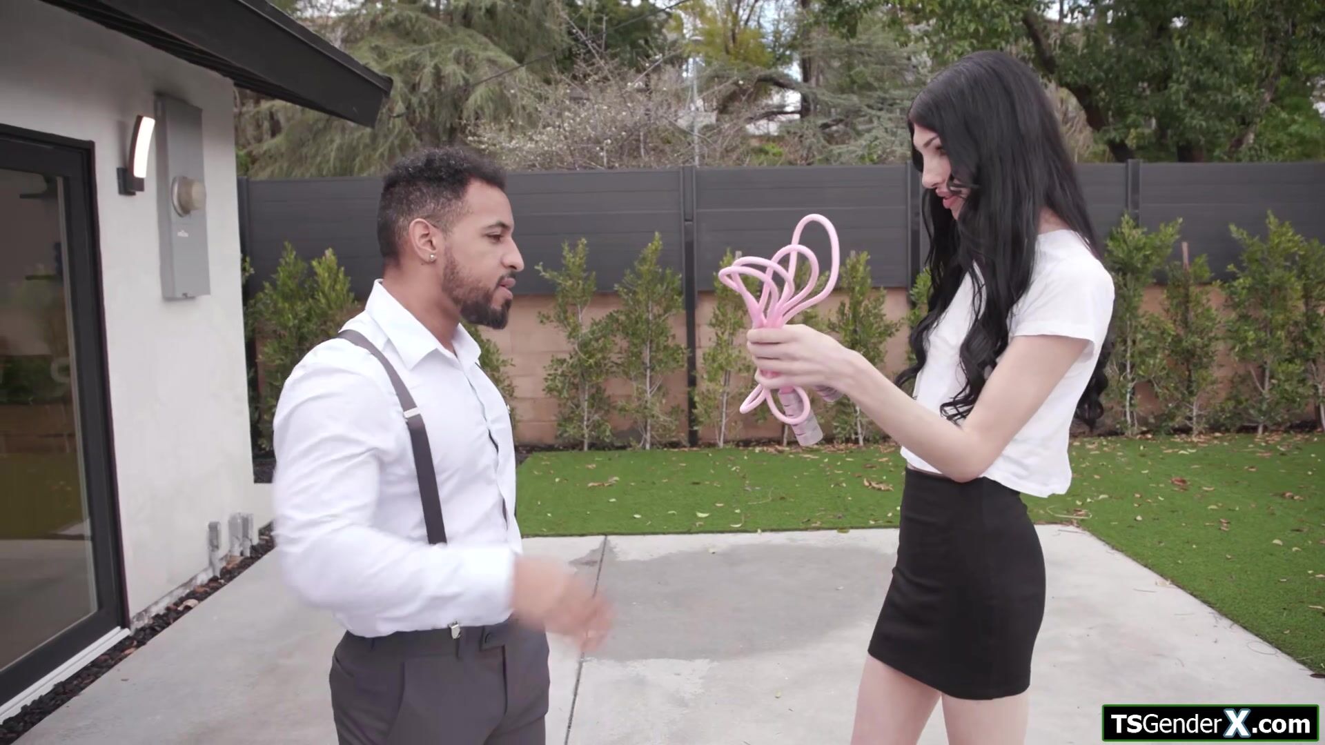 Skinny teen tgirl babysitter Ava Holt is tied up by her boss and felt up.The small tits shemale is sucked off and he rims her tight ass.He deepthroat facefucks the brunette tgirl and unties her so she can bareback anal ride on his big cock