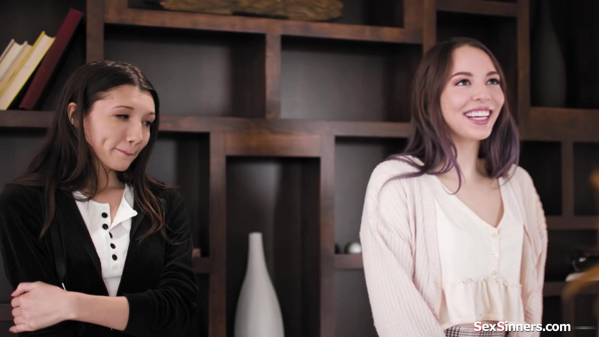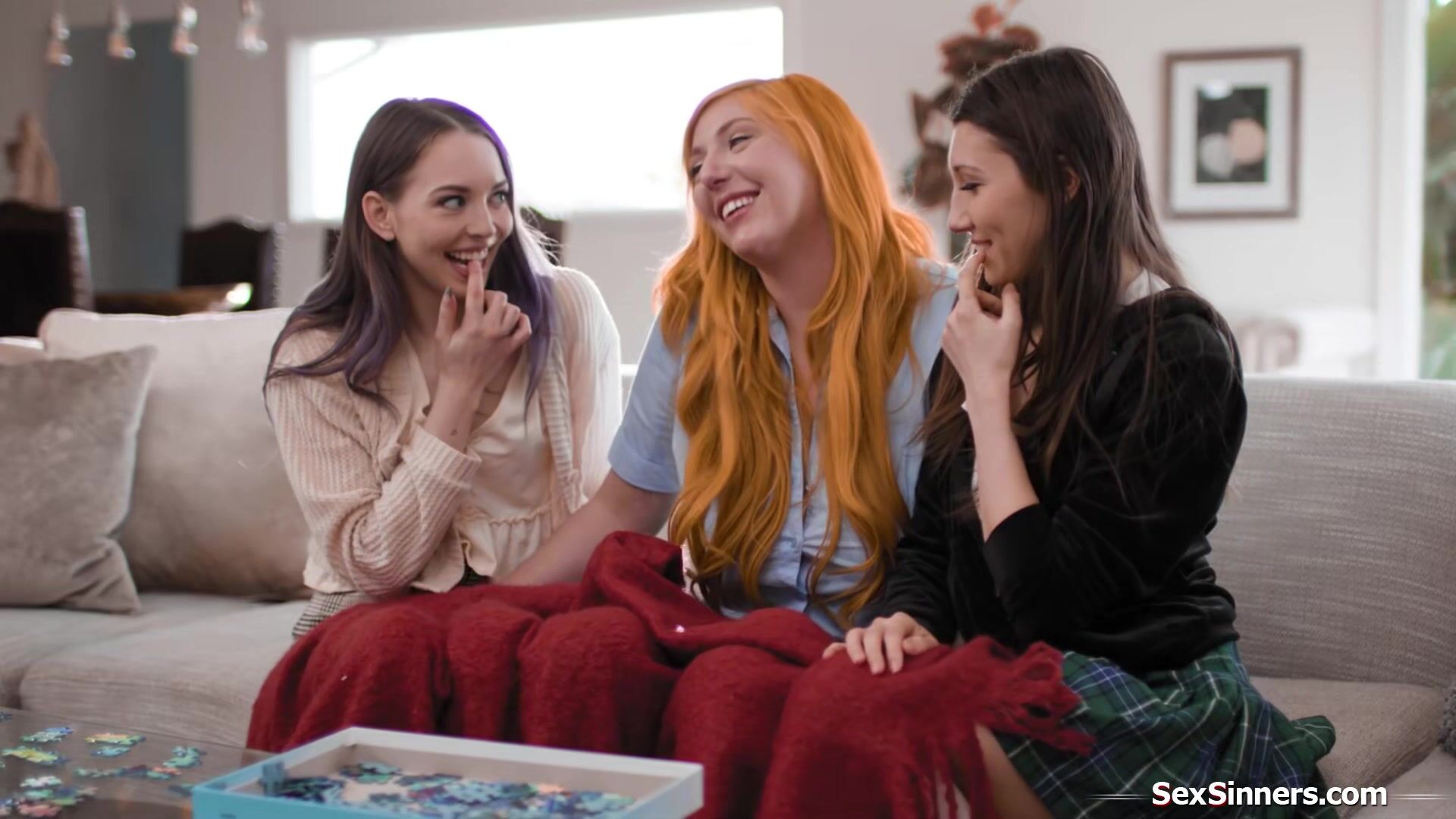 Busty redhead lesbian Lauren Phillips is happy to be a mentor for two inexperienced teens Maya Woulfe and Lily Larimar.The milf teaches the petite brunettes how to kiss.She licks the small tits babes first and then let them have their first taste