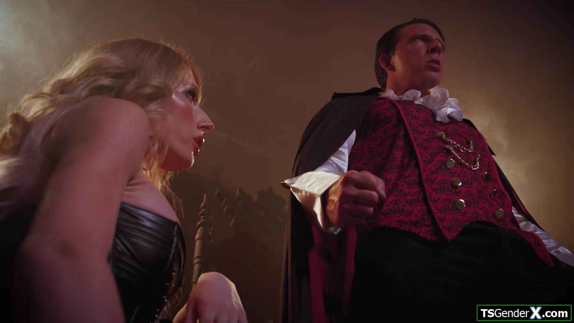 Busty big cock tgirl vampire Jade Venus wants to lower Draculas rage abd offers to suck off his dick.The big tits tgirl gets a deepthroat blowjob in return.The big boobs blonde trans gives a double handjob and bends over to get anal barebacked