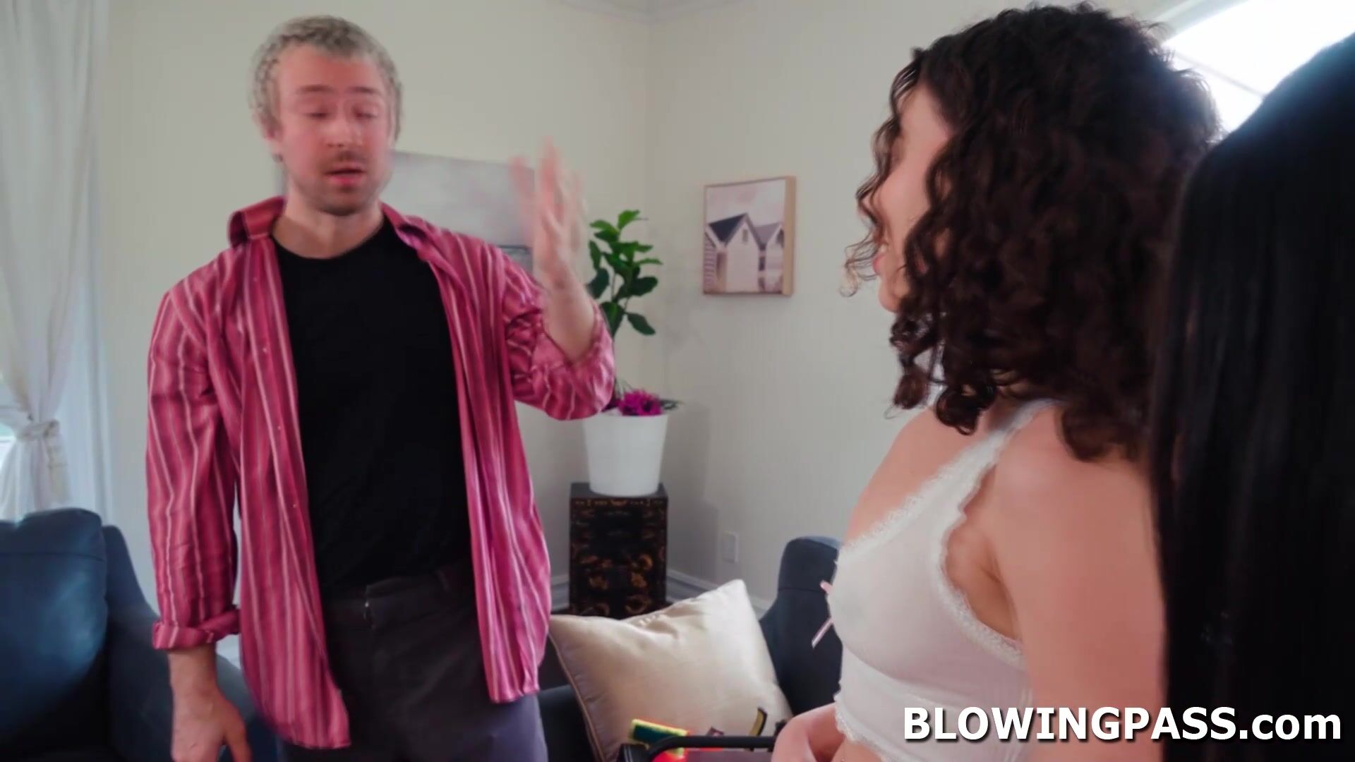 Teen latina Reyna Belle and her best friend Satine Summers are flirting with the handyman. They wear their sexy lingerie hoping to get him hard. The guy indeed gets a boner, he grabs Reyna's big tits before letting them take turns sucking his cock.