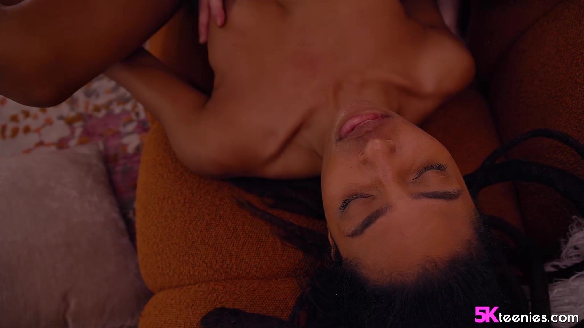 Ebony Katana Black shows off her fit body.The black babe deepthroats Ryan Madisons big white cock and he catches her saliva and starts to masturbate her shaved pussy while she gives him a handjob.The brunette gets her snatch oiled up for a banging