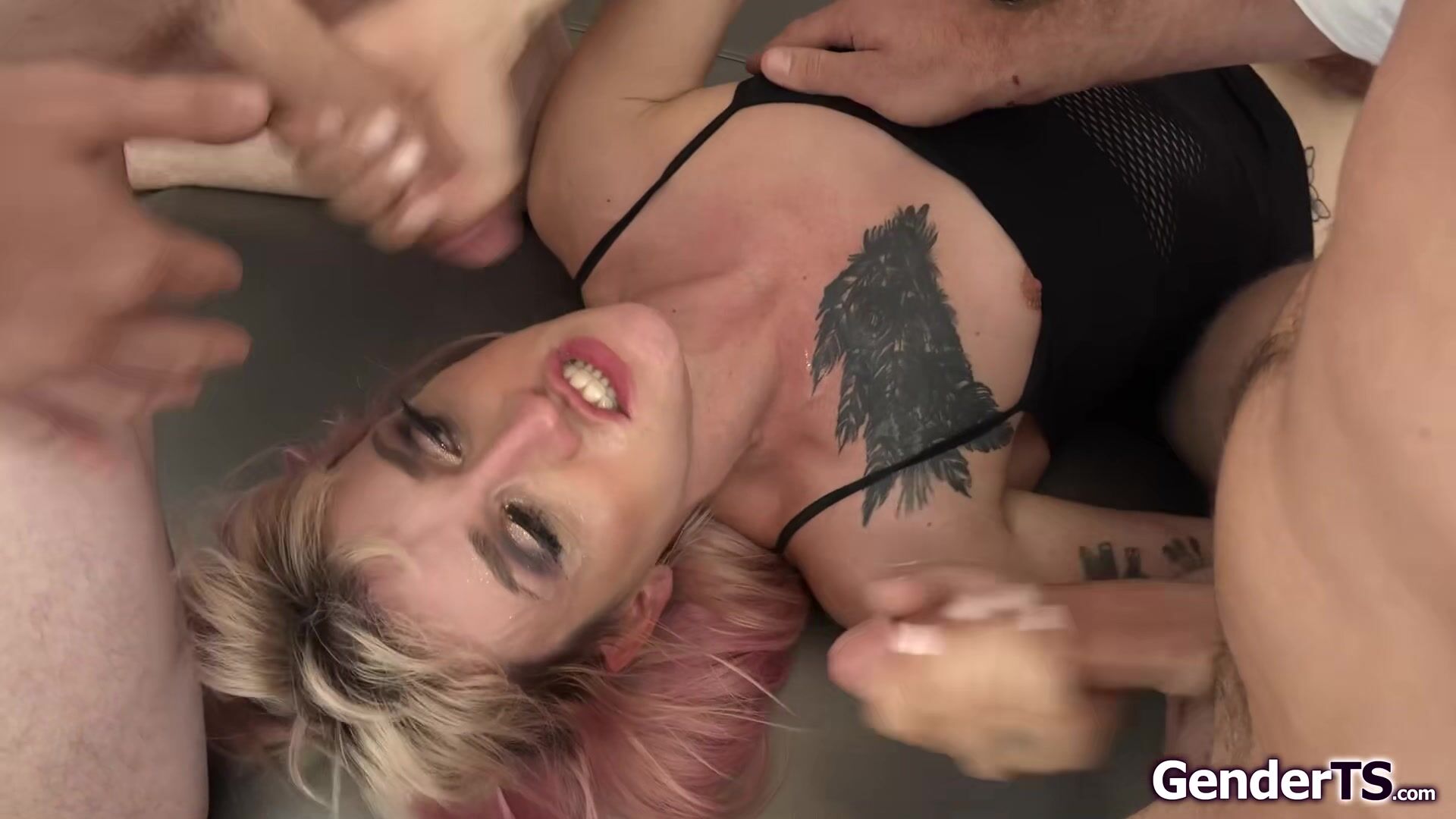 Tattooed shemale Lena Moon excited for the five big cock that are going to fuck her.The small tits tgirl deepthroats their dick.The blonde trans is barebacked while giving a blowjob.The tranny is facefucked while she is double anal gangbanged