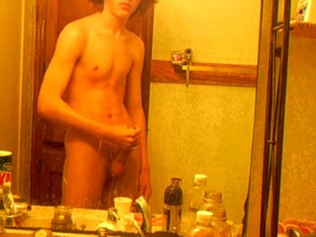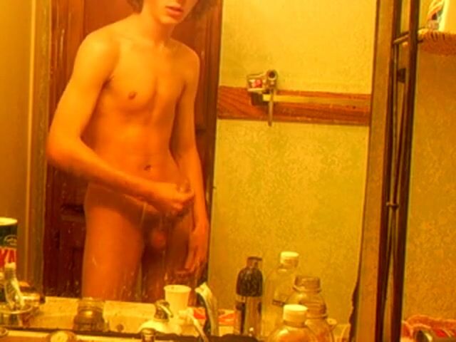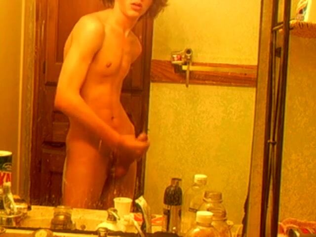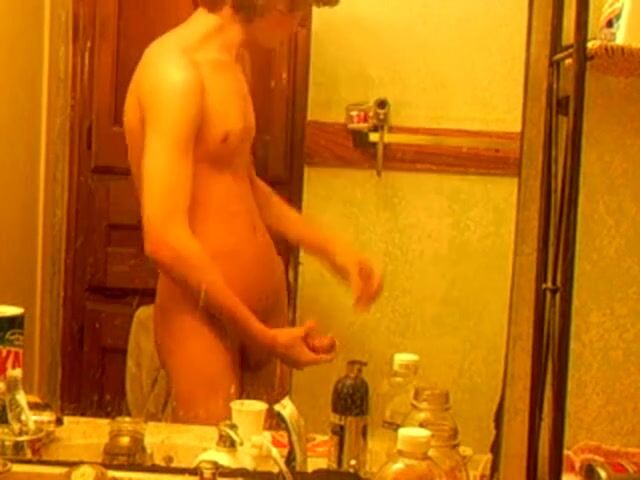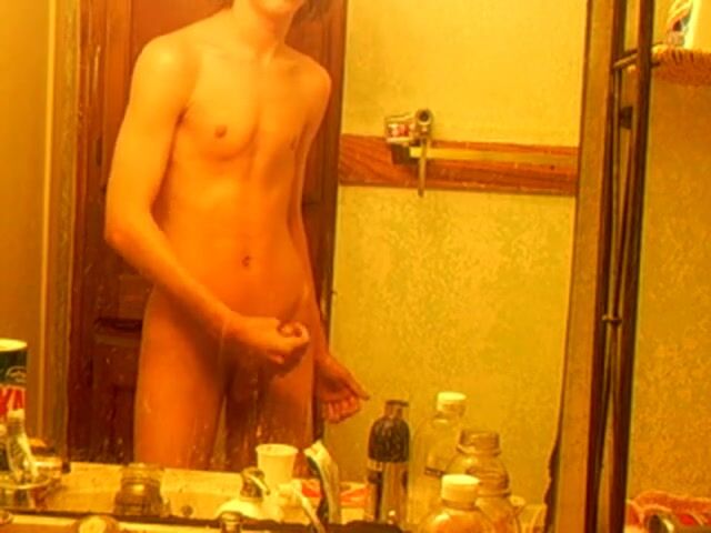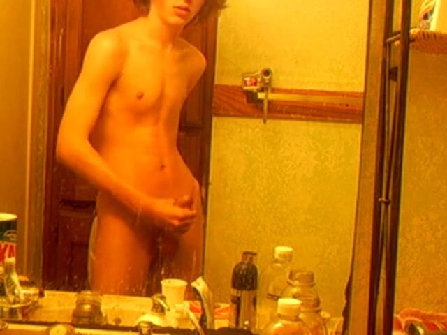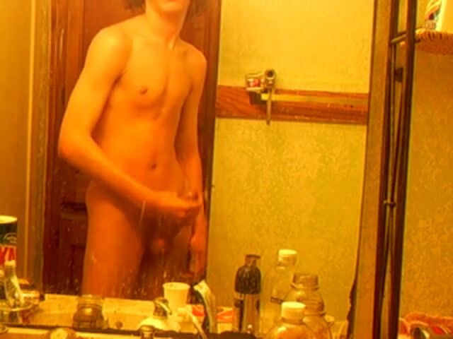 A hot skinny boy with curly hair films himself jerking off in the bathroom mirror.
