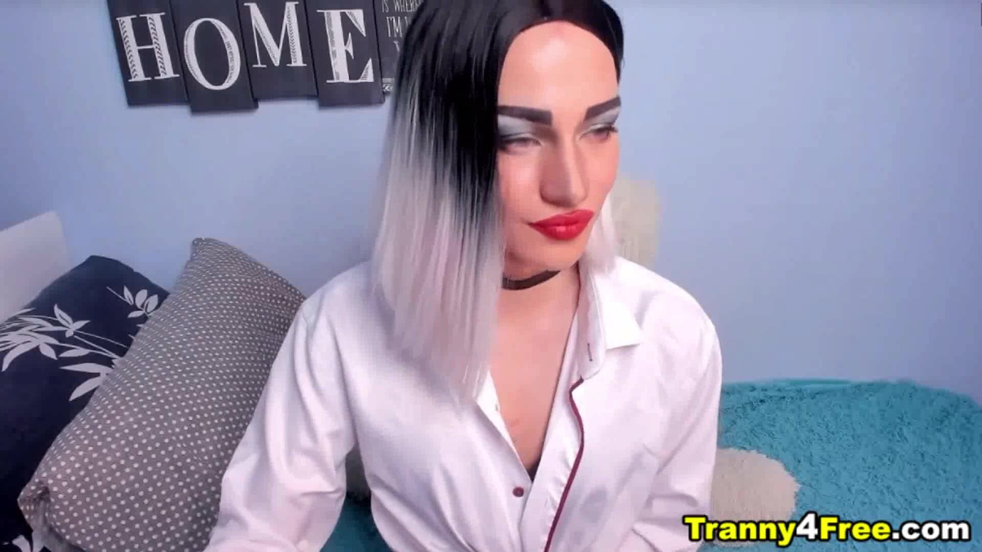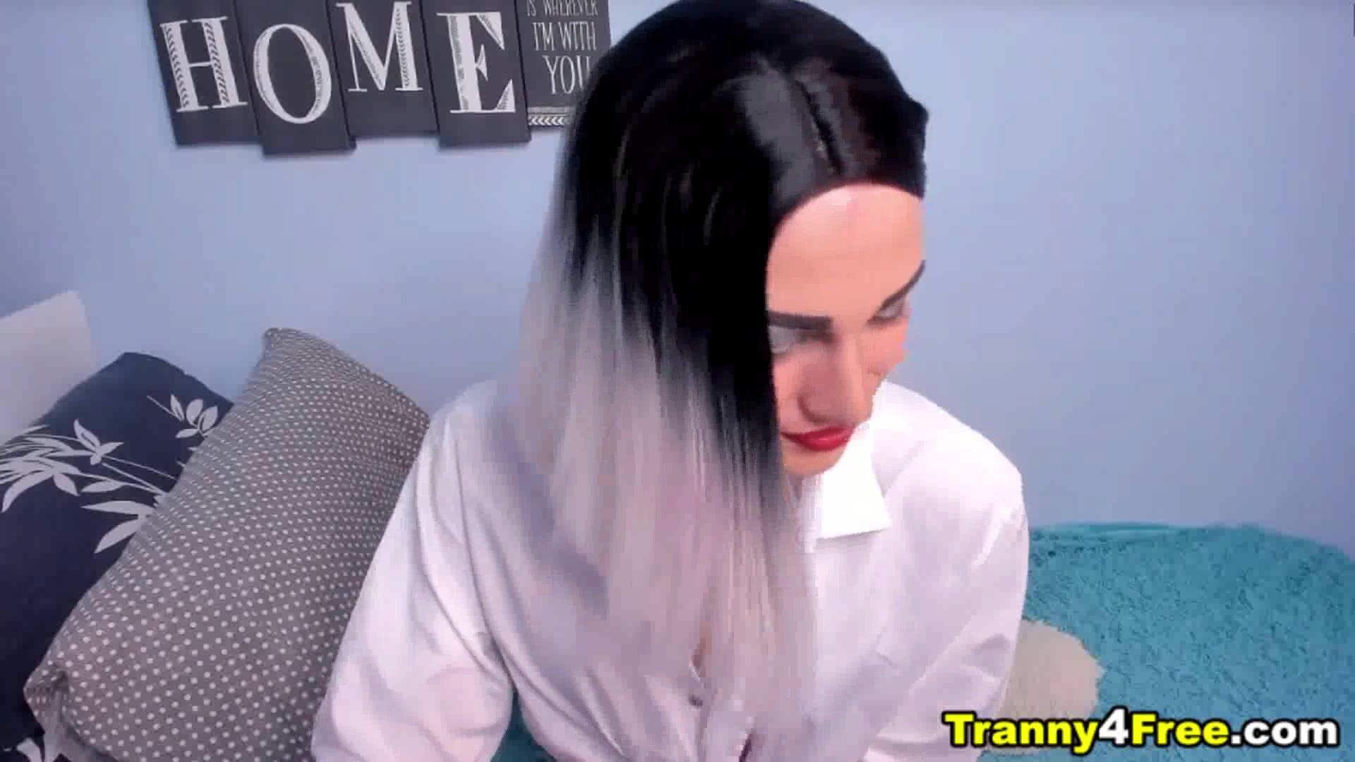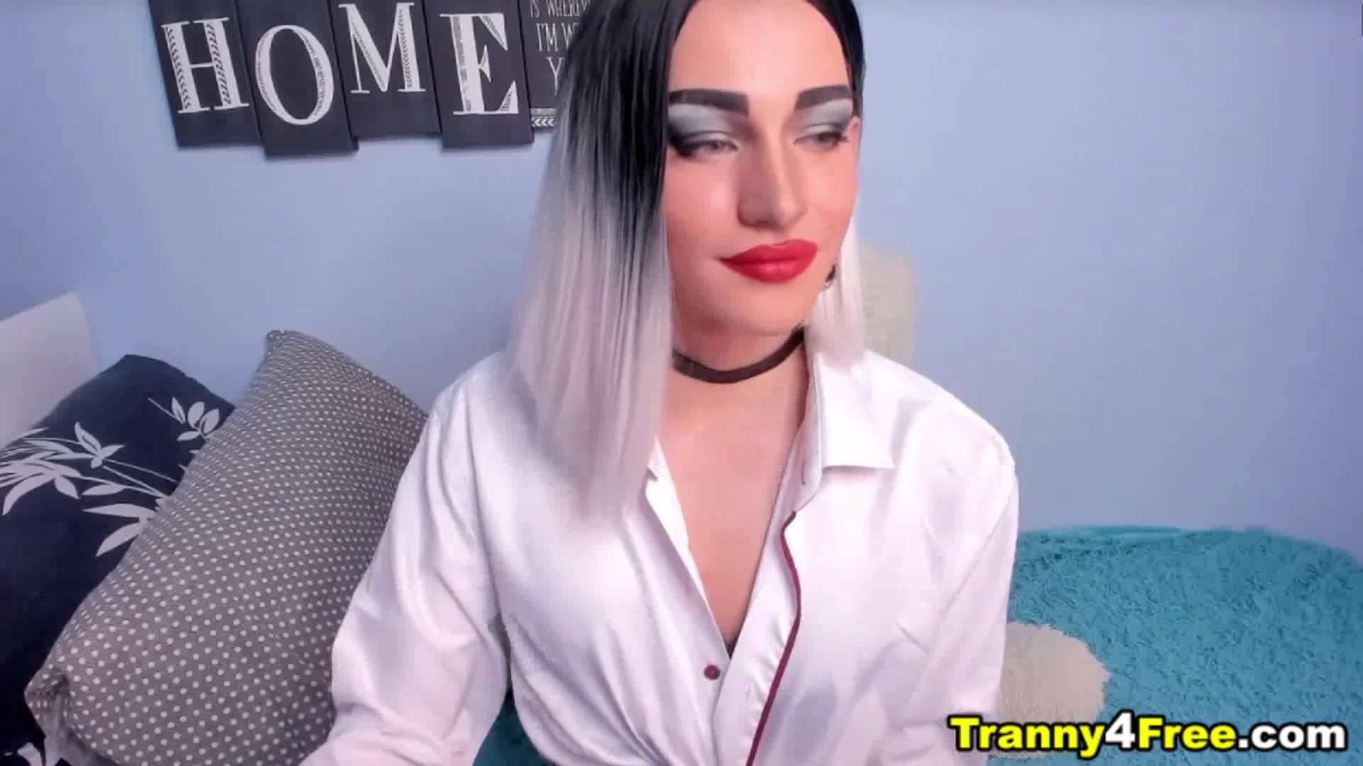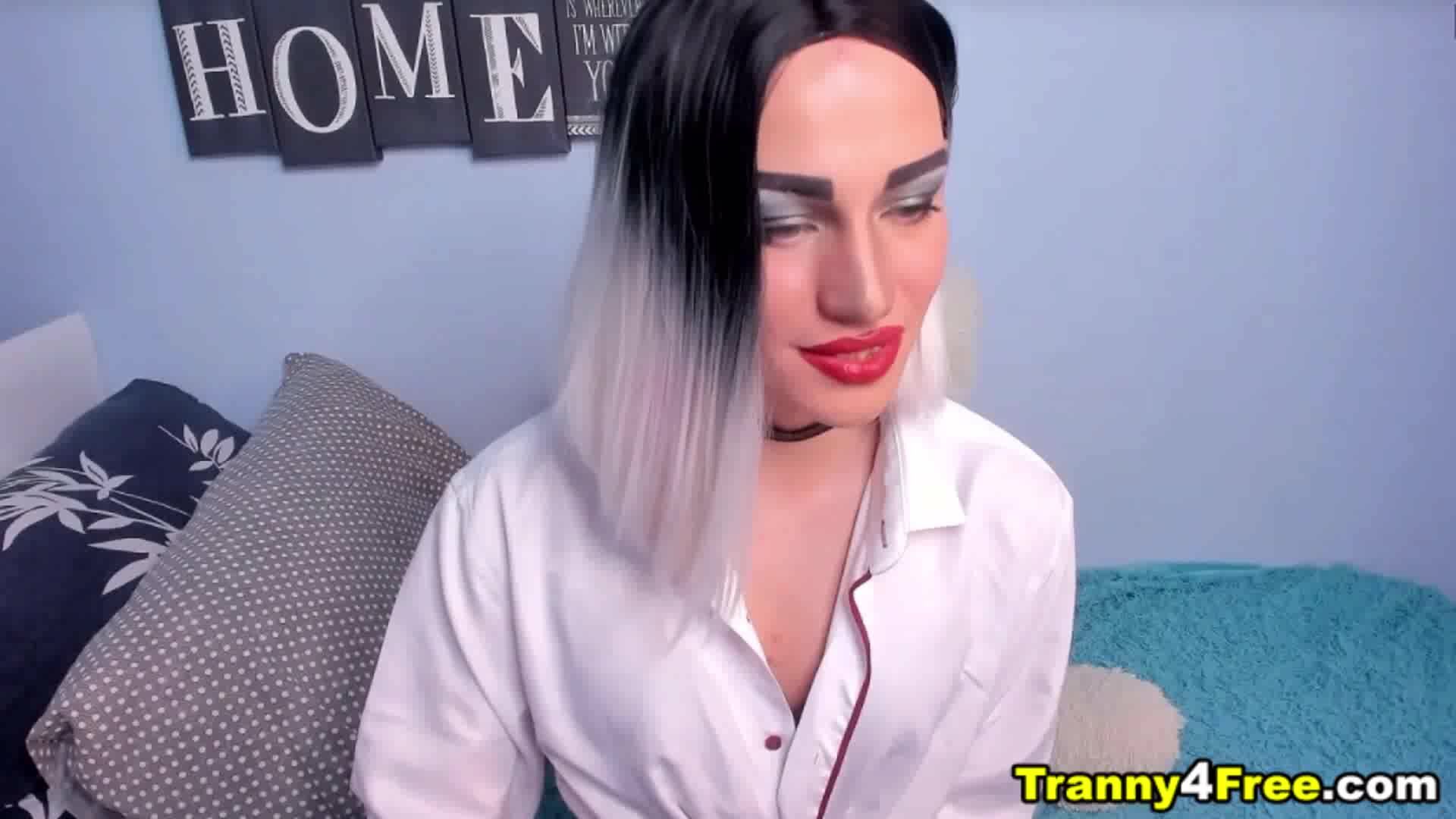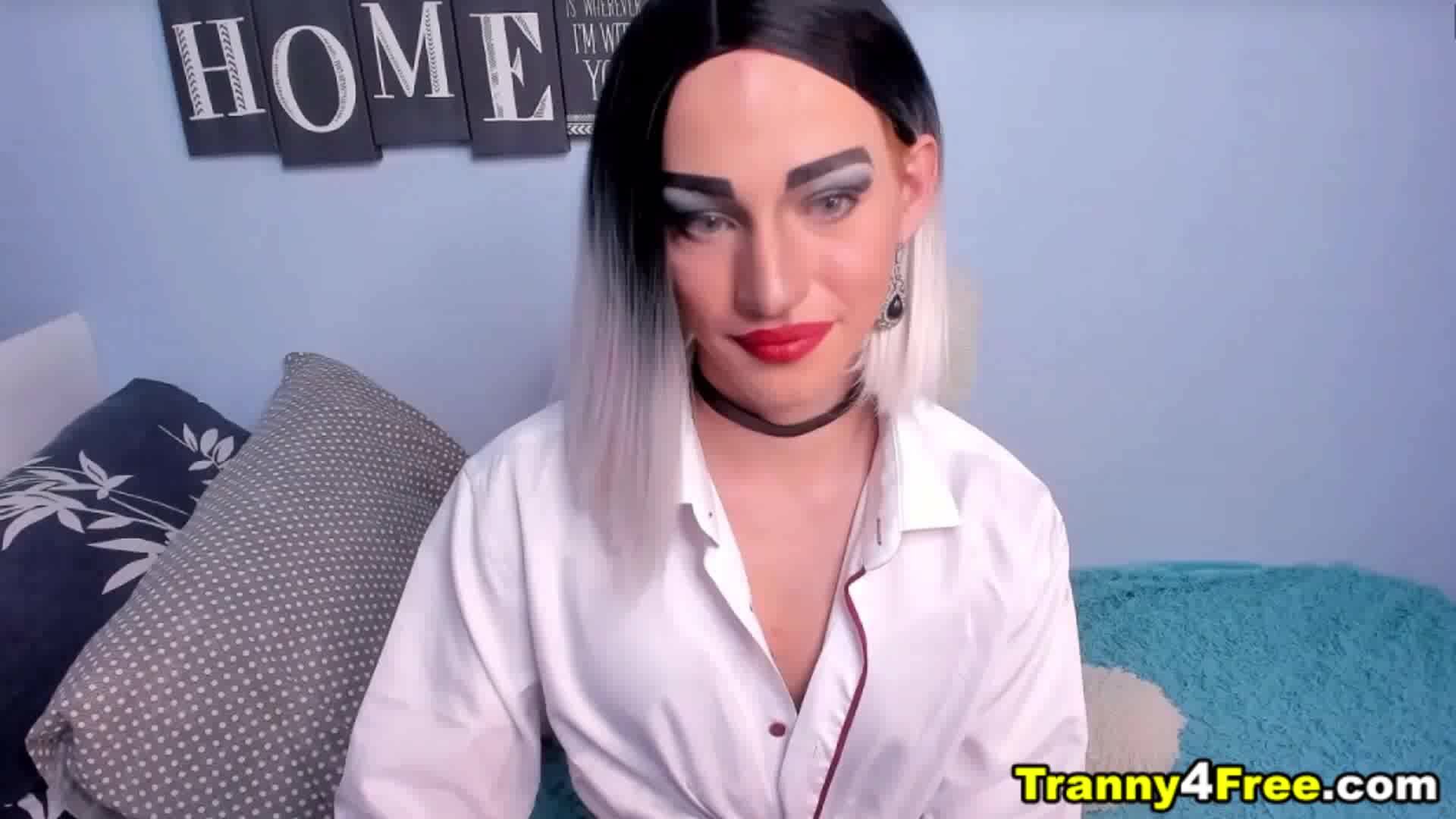 She has her big cock hiding between her legs and when she release it its time for her to masturbate. Cute and sexy trans gender girl takes off and grab it firmly from her panty and strokes her dick while on live in a pornsite. The small breast trans gender girl grabs her big dick and makes it hard before taking off her panties. She jerks herself off and rubs and stroking her cock using her hands she kneeled in the couch giving a clear nice view of her cock and she continues to play with it. Enjoying her self while many people watching online.