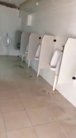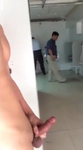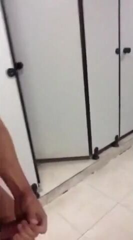 Young asian boy jerks off outdoor in public bathroom. 2 guys came in while happened and one caught him when cum