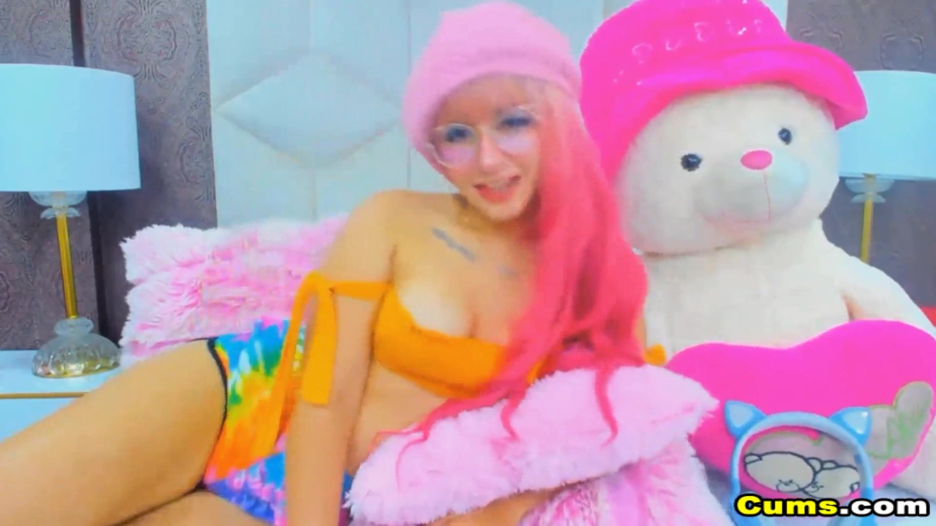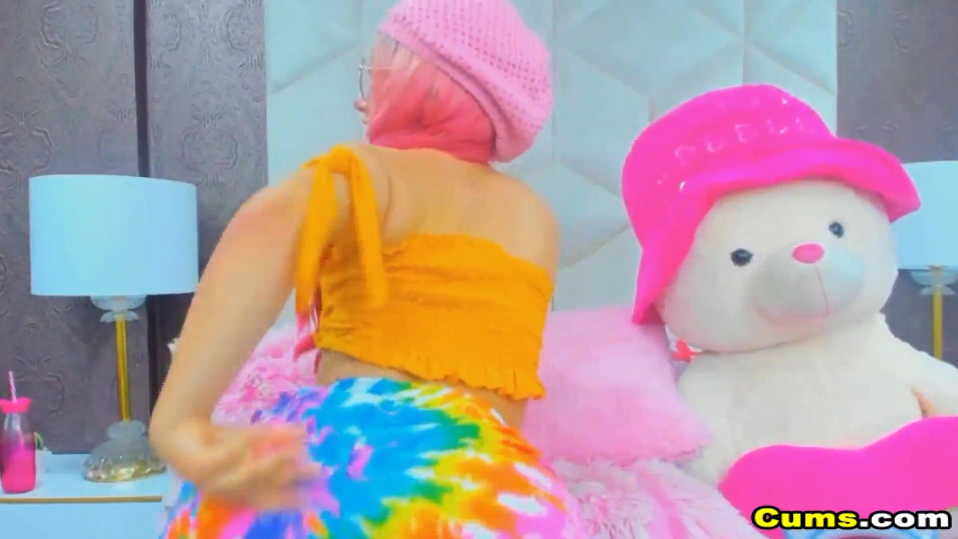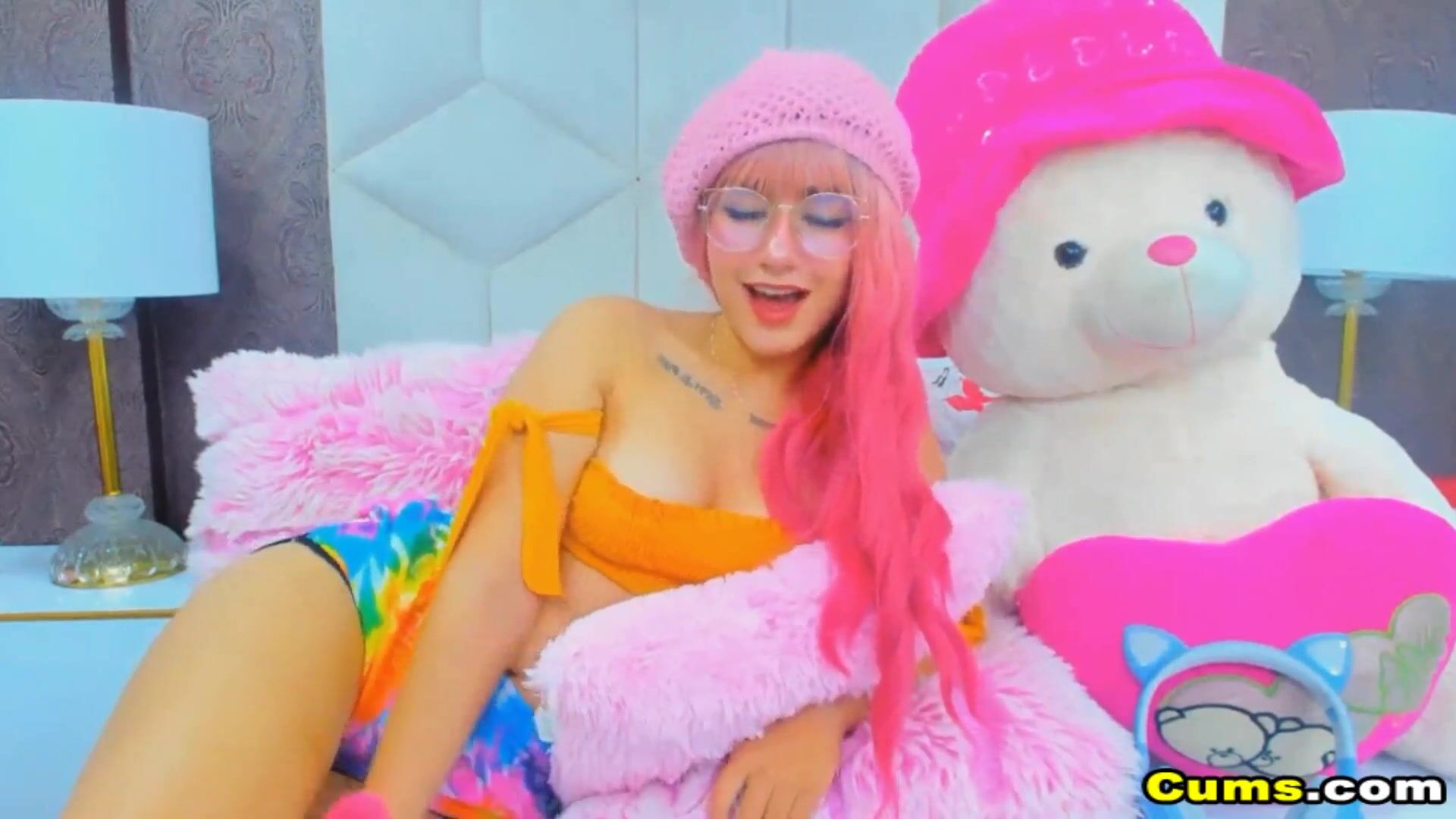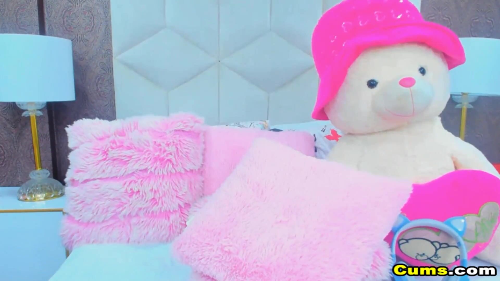 She dance while taking off her clothes showing her perky tits and petite body. She kneel down with her dildo in bed and starts sucking and licking her huge dildo toy playing with her tongue.