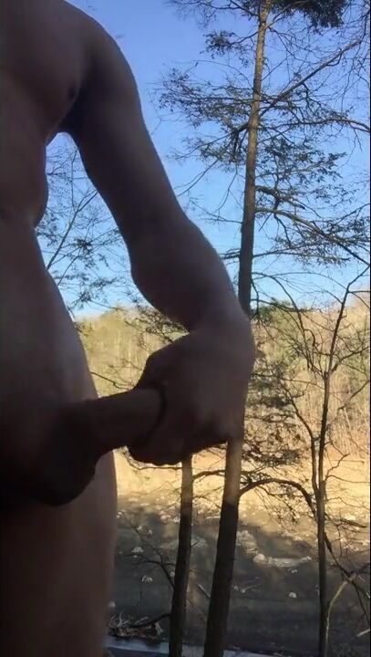 Jerking my cock completely naked in the woods. Lick the cum off my fingers at the end