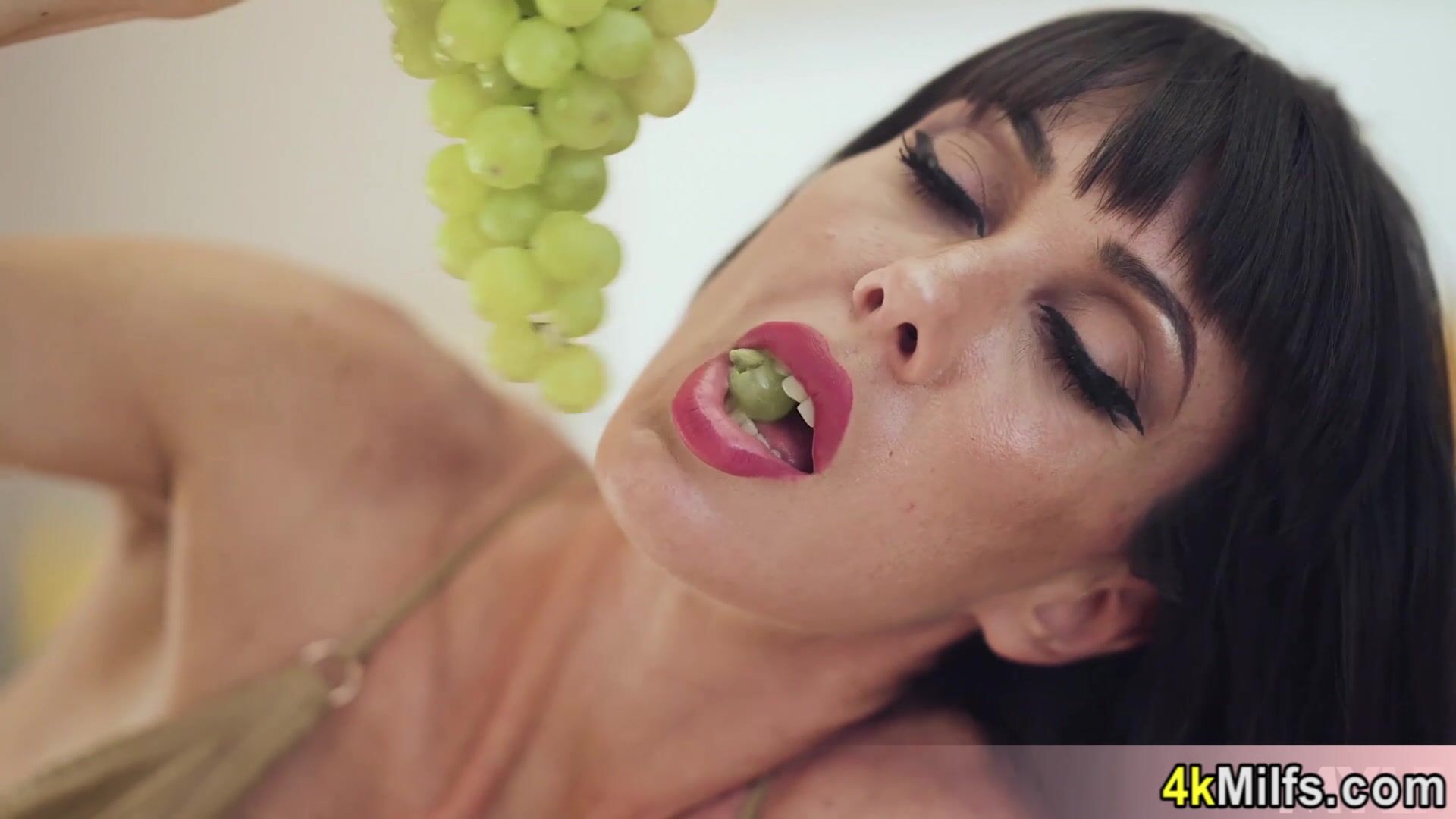 Guy feeding a skinny brunette mature Sofia Star with big fake boobs som grapes then the big cocked dude takes off her swimmsuit and fucking her shaved pussy and prestty face