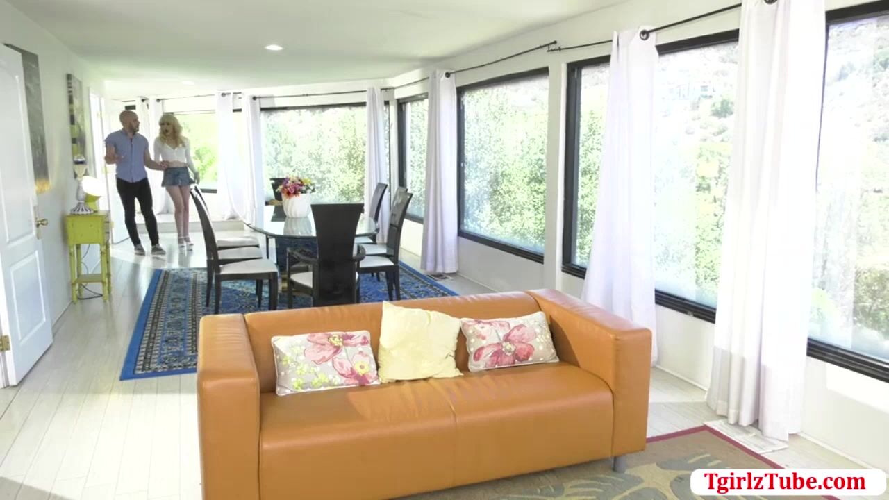 Horny bald tells his friend that they will let the shemale hitch hiker take a ride with them.After that,he lets the shemale suck his big cock and he then barebacks her tight ass in his house.
