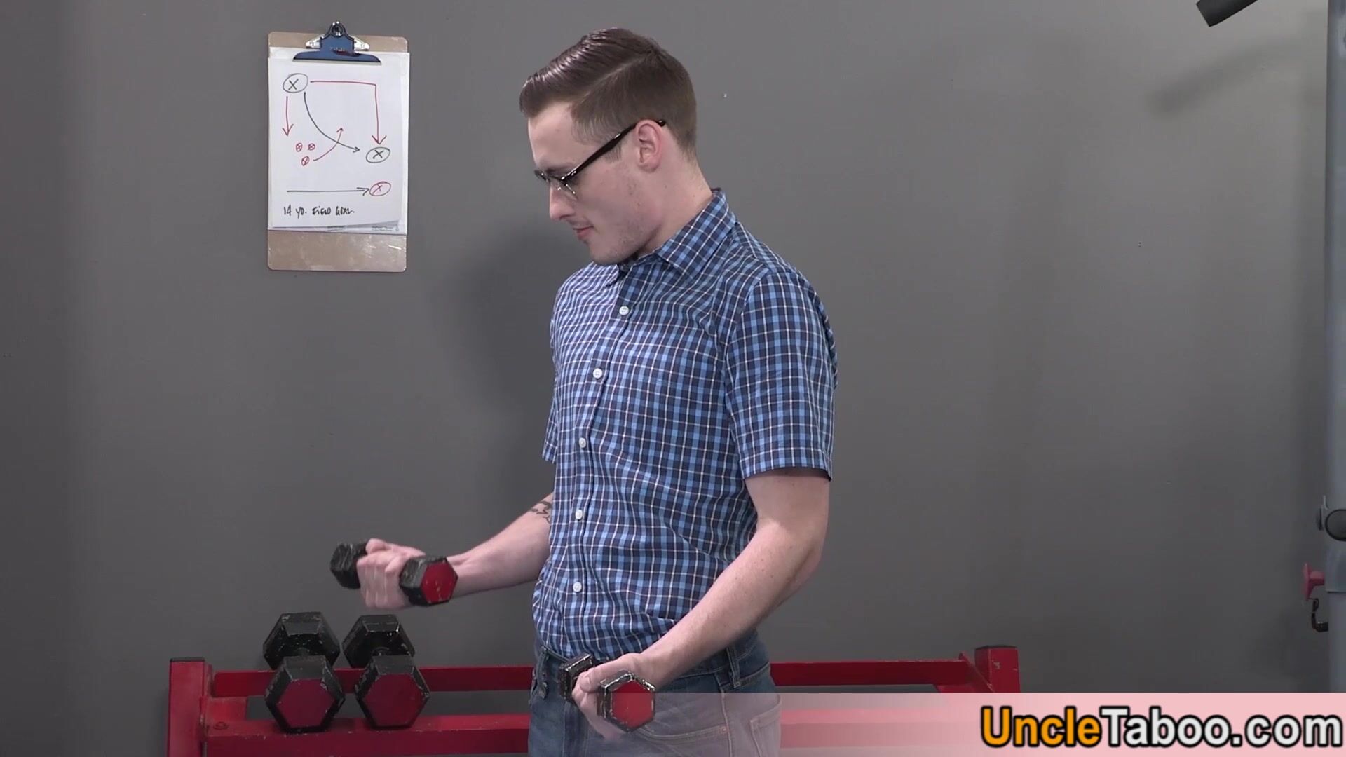 Nerd guy in glasses wants to get some muscle so he using dumbbell when his stepbrothers comes and offering a unique way to improve himself He ordering him to get on his knees and suck his big dick then fucking his ass bareback from behind