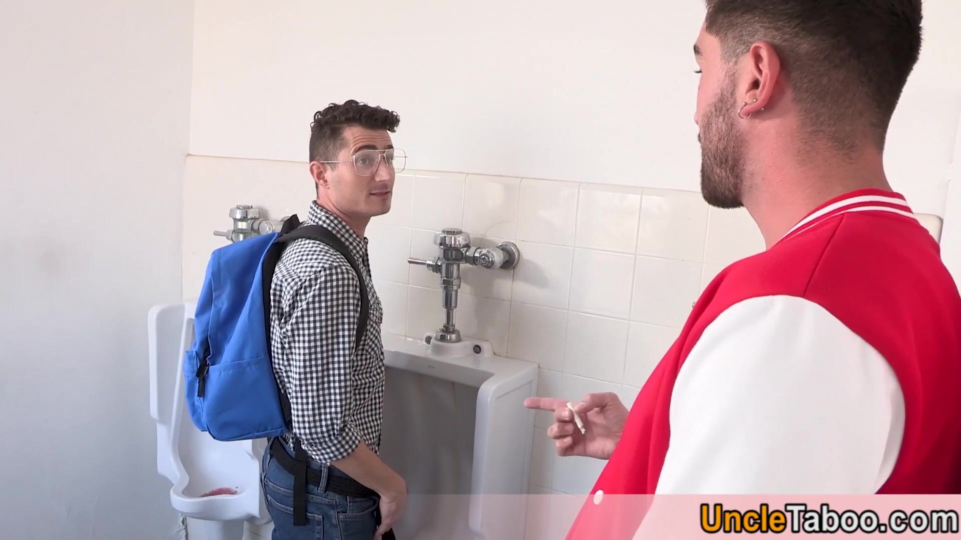Muscle inked stud Robbie Caruso ordering a scared bookworm dude Chris Damned to suck his big dick in the toilet then he is anal fucking him bareback in doggystyle