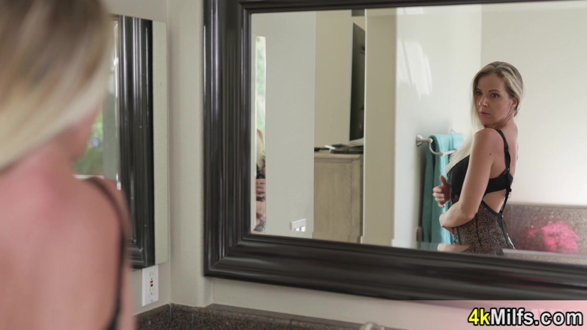 Blonde skinny mature Anita Blue with big natural tits takes on her black satin lingerie and stockings then grabs her husbands big cock and giving him a sloppy blowjob She bends over and hubby fucking her shaved pusy in doggystyle