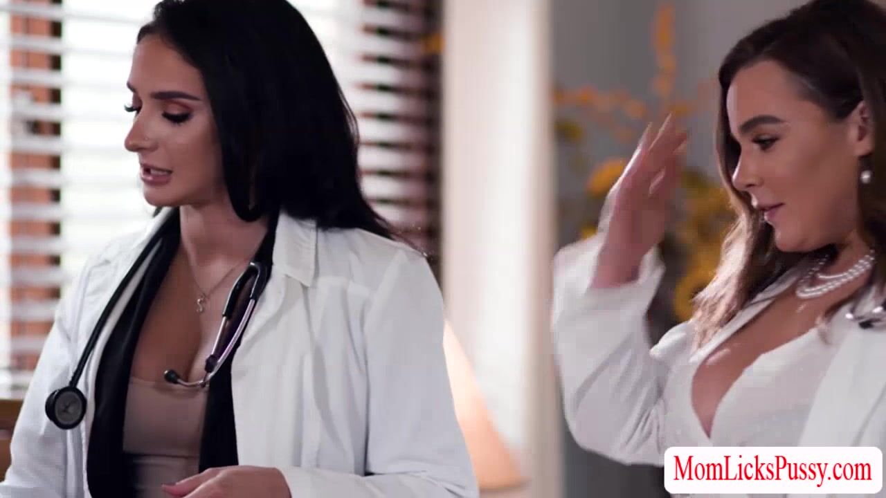 Two busty doctor milf check their stepdaughter if shes having a fever.After that,they get horny and decide to do threesome sex.They start kissing each other and they lick their wet pussies so hard.
