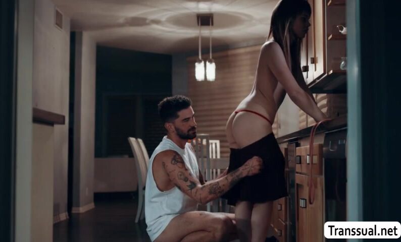 TGirl Kate Zoha is on the kitchen with her Stepbro and they are talking. After a few minutes of talking, They suddenly kiss each others and get naked. Not long enough Kate then sucks dudes cock and then gets her pussy fucks hard from behind.