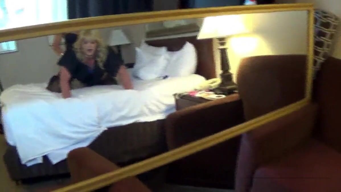 Cortney with Purple Hair, long white eyelashes, black corset and thigh high boots fucks SherryG with her large gurl cock while Sherry wants more and more.