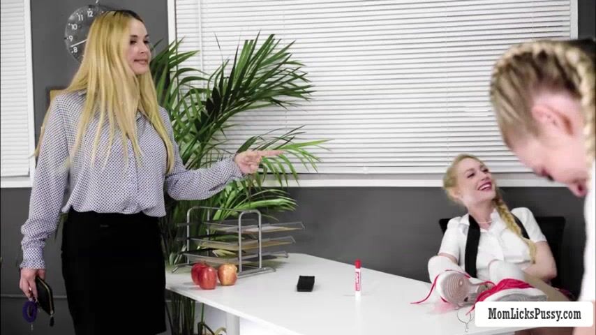 Busty teacher milf spank the asses of her two teen stepdaughters while they are in her classroom.After that,they get horny and they get naked and start licking their wet pussies in threesome way.