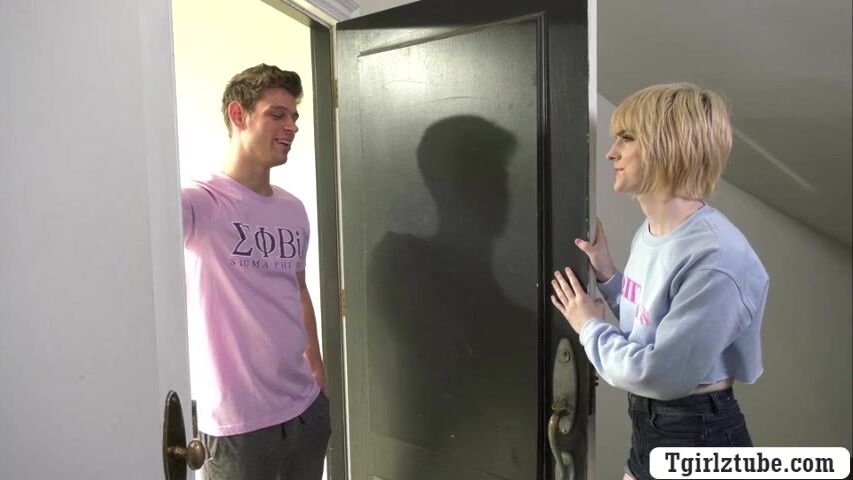 Shemale blonde welcomes her fellow frat mate into her place and she lets him sit on the couch.After that,the guy pulls out his dick and lets her throat it passionately.In return,the guy barebacks her wet ass so deep and hard.