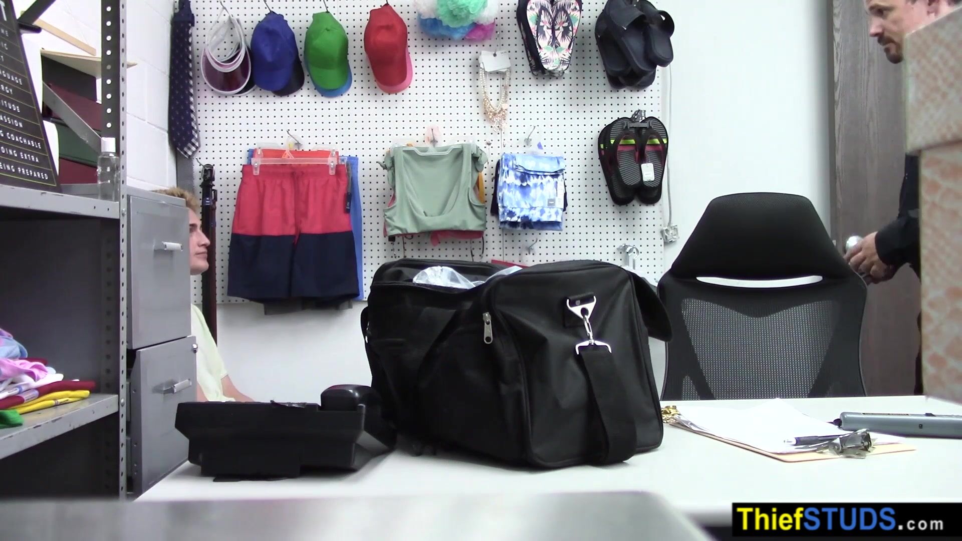 Security officer Jesse Zeppelin brings thief Braden Taylor into the backroom to confront him who denies being guilty so officer submits him to a strip search and a deep cavity search and orders him to suck his big dick then he is fucking him bareback