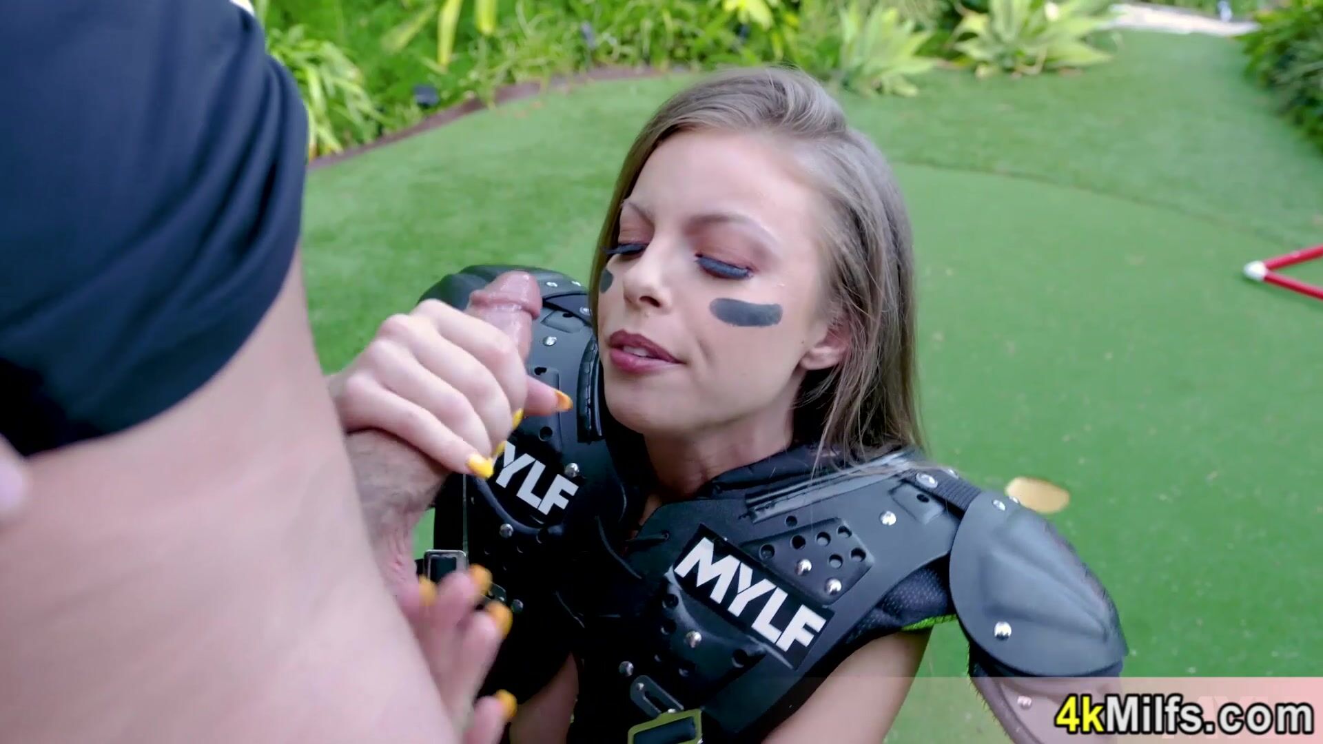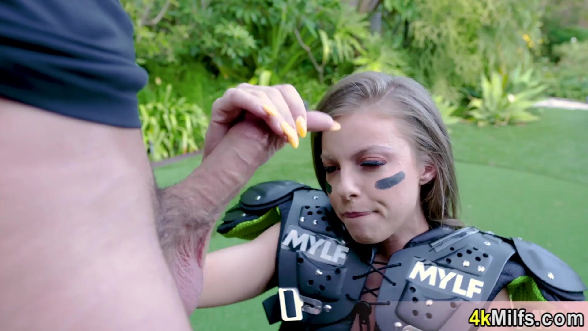 Bombastic brunette MILF Britney Amber with big boobs in sexy uniform doing her daily football practice but her trainer cant resist her perfect shapes so he is fucking her hard but first she is sucking his big cock outdoor