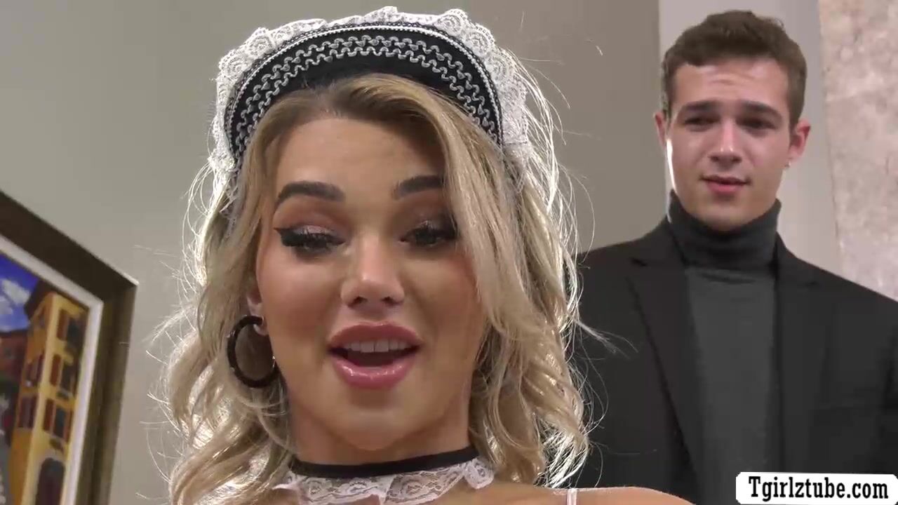 Shemale maid saw a sex toy and she then uses it to masturbate her tranny dick.After that,the horny trans throats the big cock of her boss passionately and in return,the boss bareback anal fuck the wet ass of his TS maid so hard.