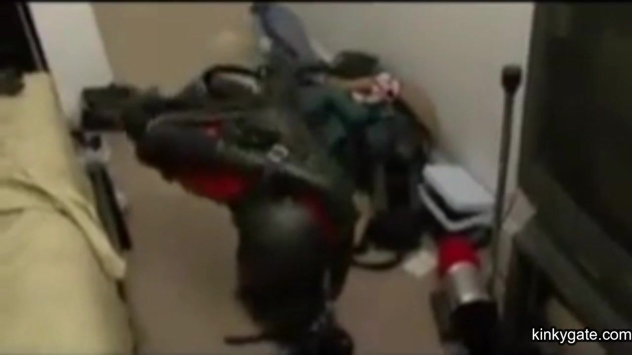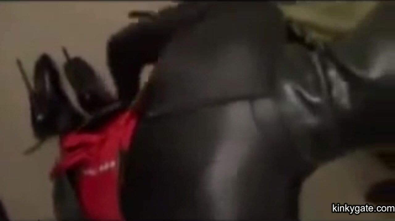 My latex slut has to make every effort to free herself, while I watch her wrestling.
