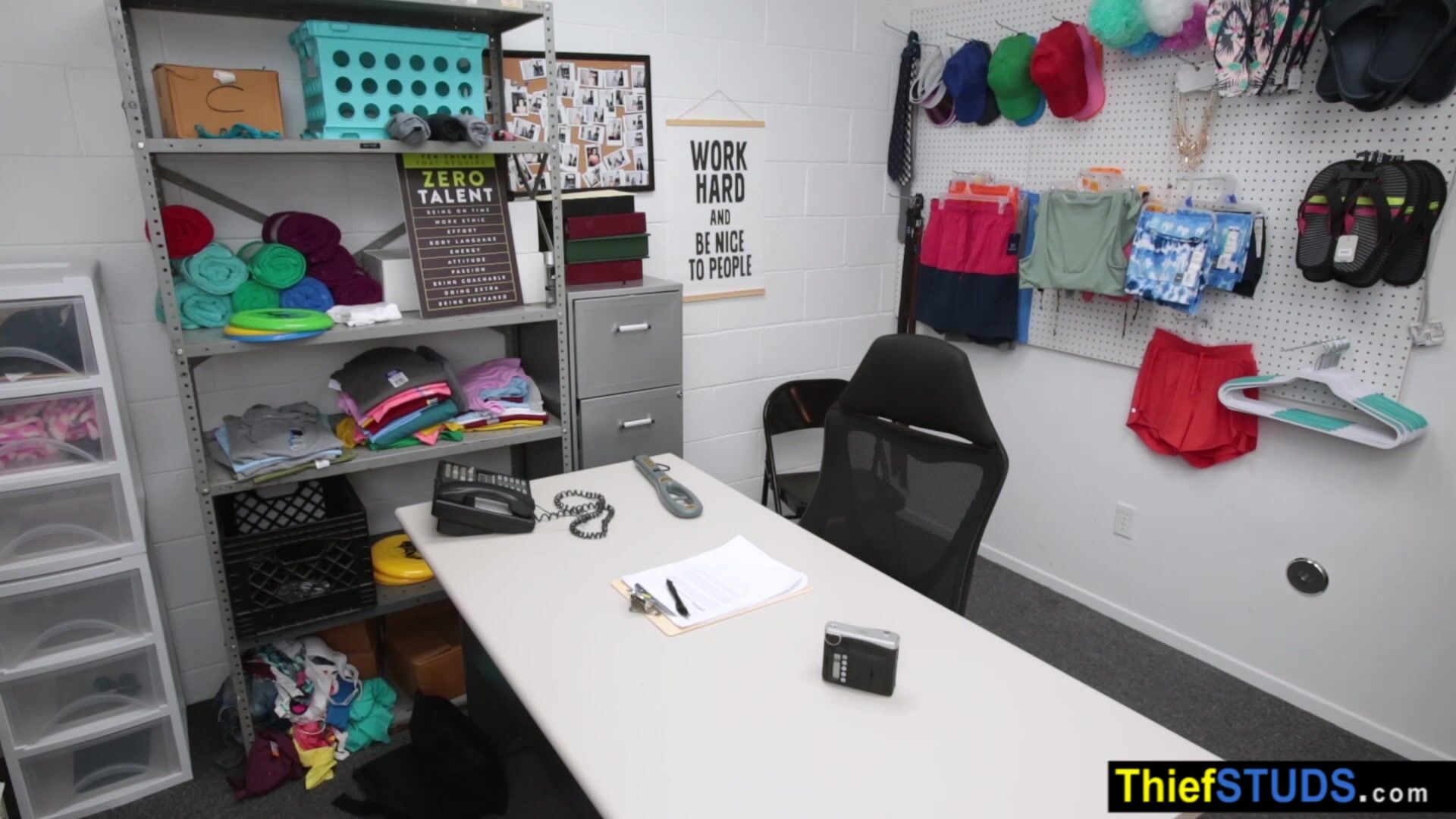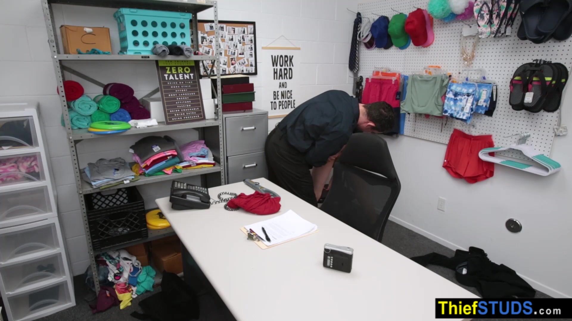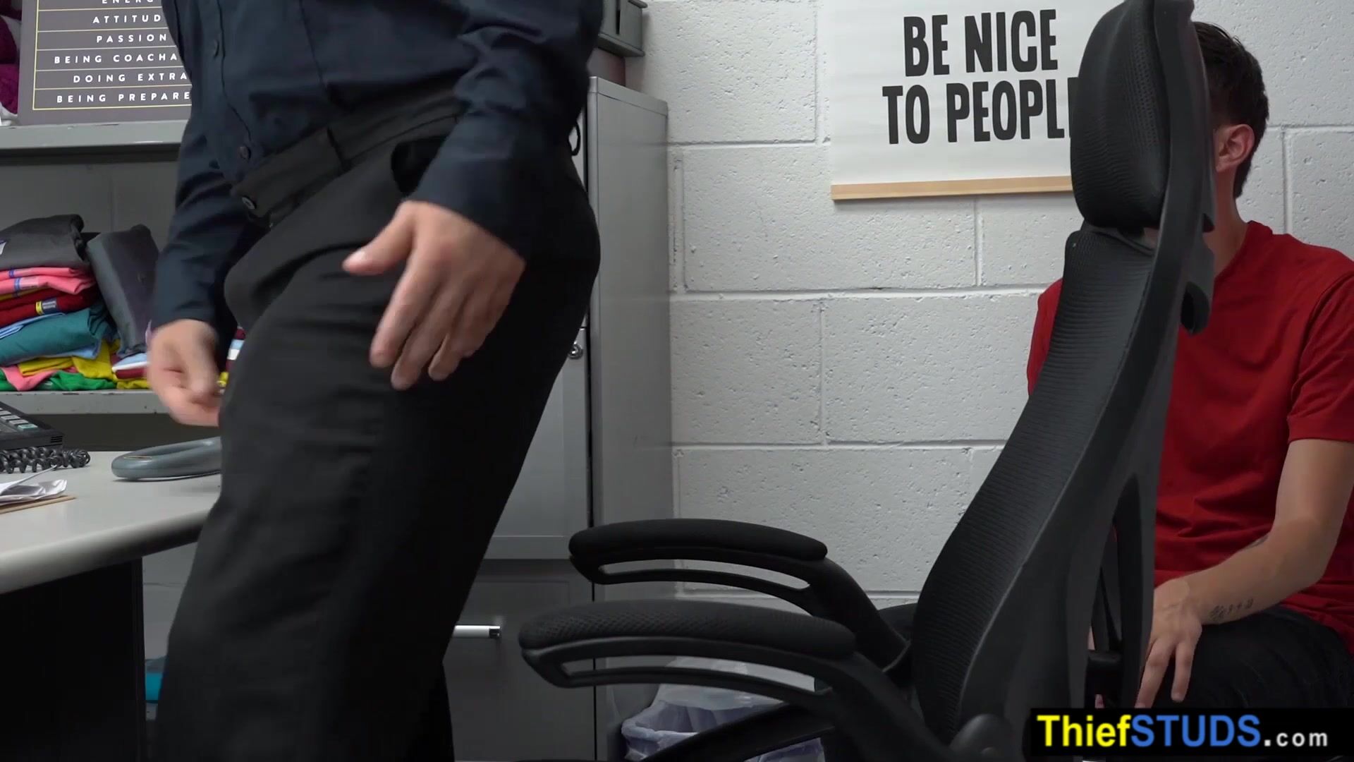 Security guard Jesse Zeppelin catches teen perp Kai Masters and brings him into the back office where he strip searchim him then ordering him to give a deepthroat blowjob then ha anal fucking his ass bareback