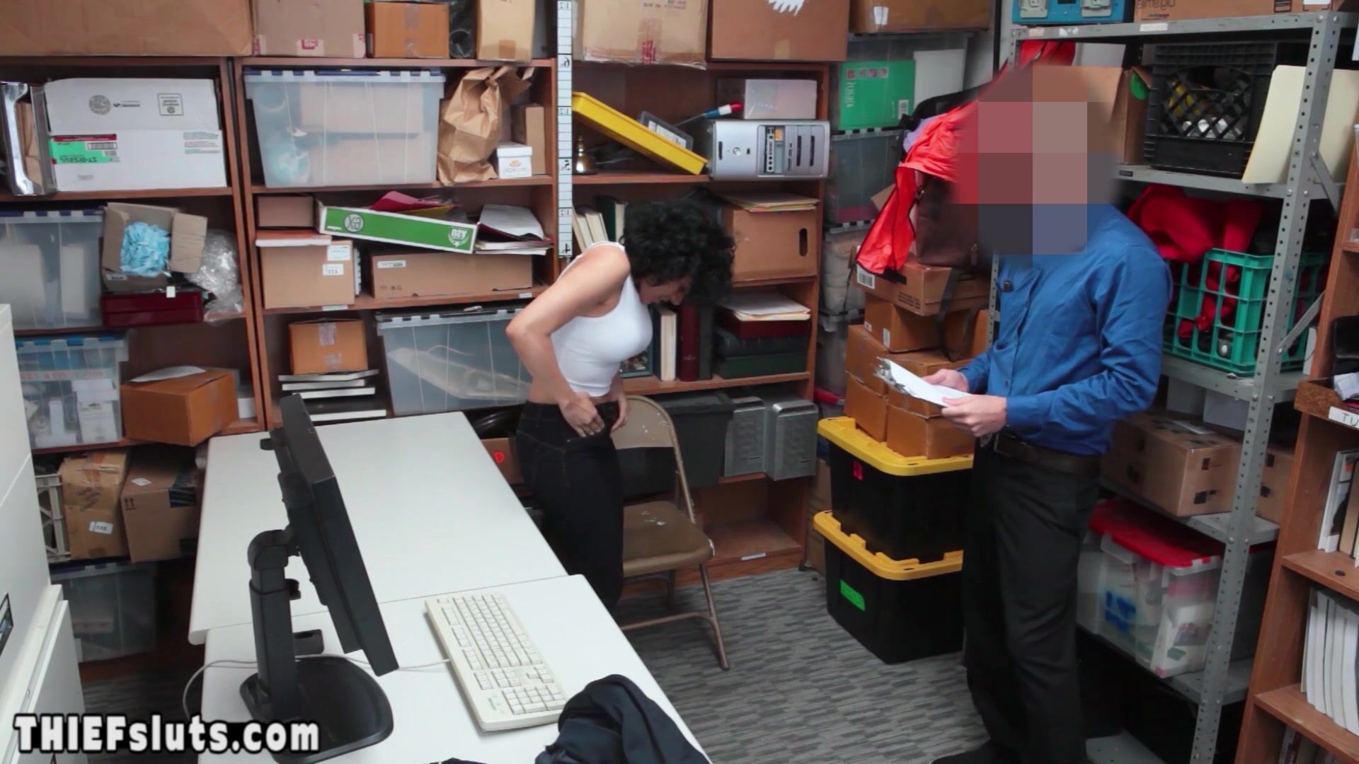 Curly brunette latina teen shoplifter with big natural tits got caught and strip searched by a dirty LP officer then he ordered the scared slut to suck his big dick then he fucked her juicy pussy really hard to teach her the rules