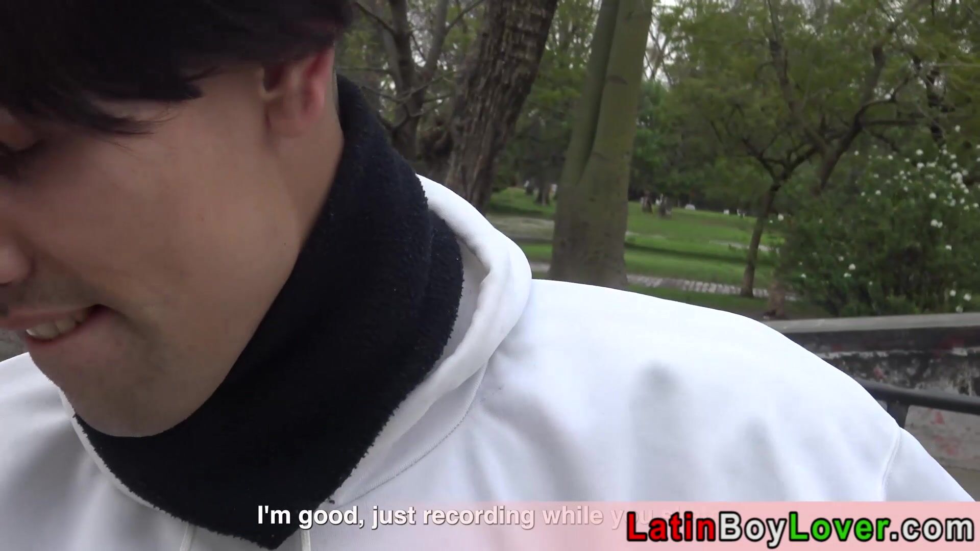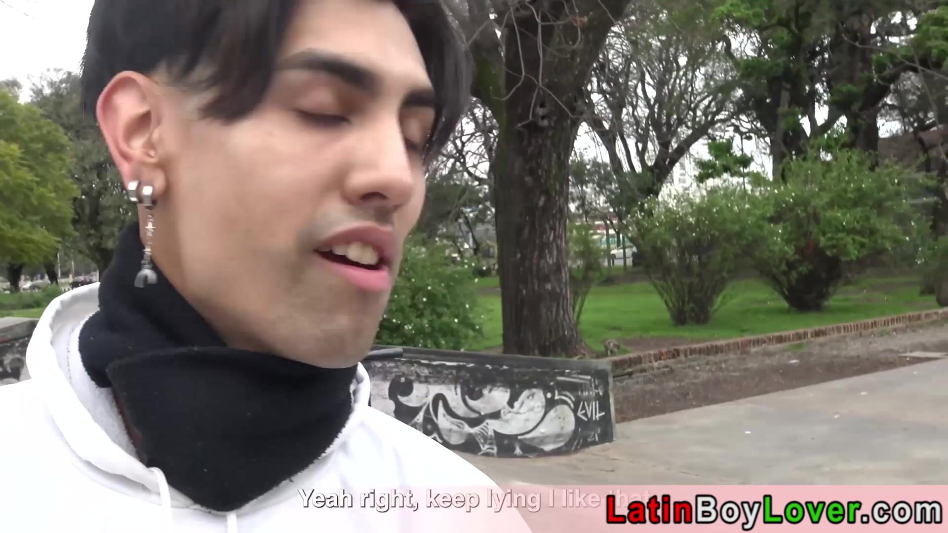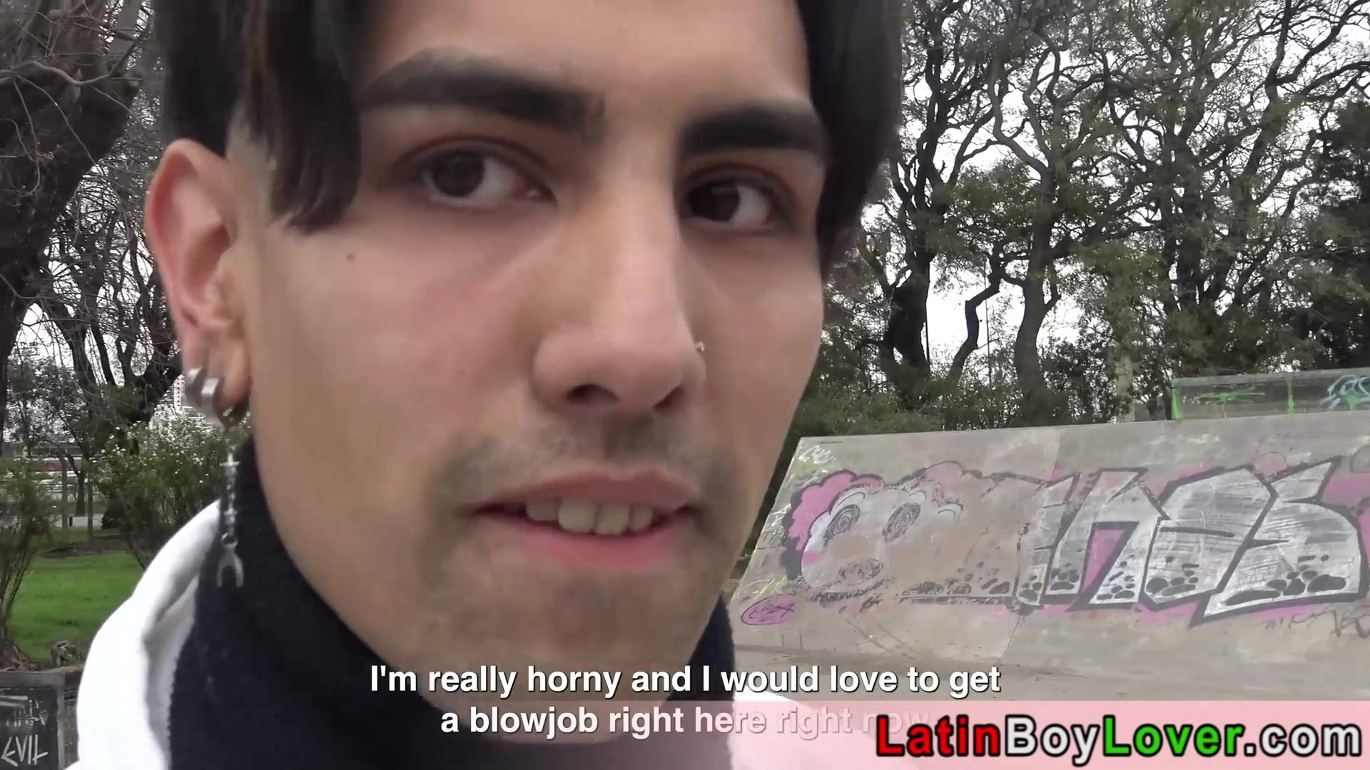 Skinny cute faced amateur latin skater twink Leo accepts a gay strangers Bryan offer so he is sucking his big cock outdoor then he lets him to anal fuck his butt bareback