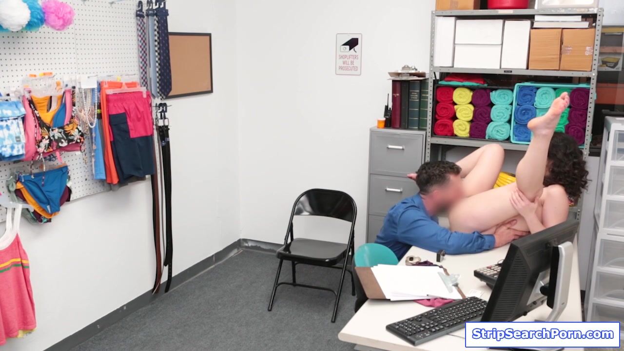 Loss prevention officer conducts strip search and recovers the jewelry inside the teen shoplifters lingerie.The busty babe begs not to call the cops and in exchange she blowjobs his big cock.The guy licks her hairy pussy then fucks her on his table.
