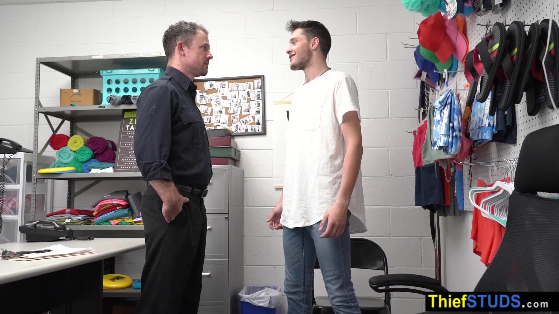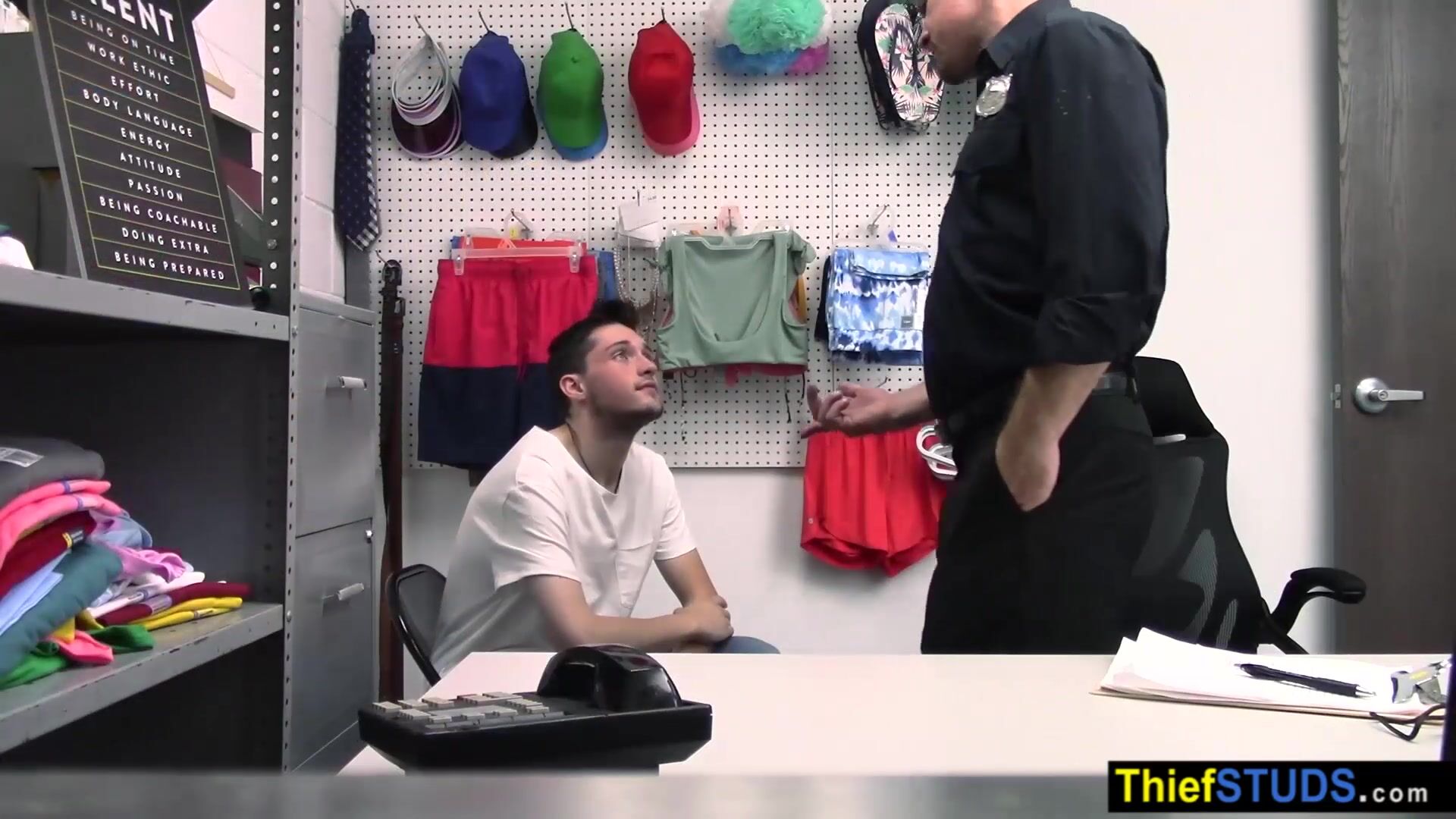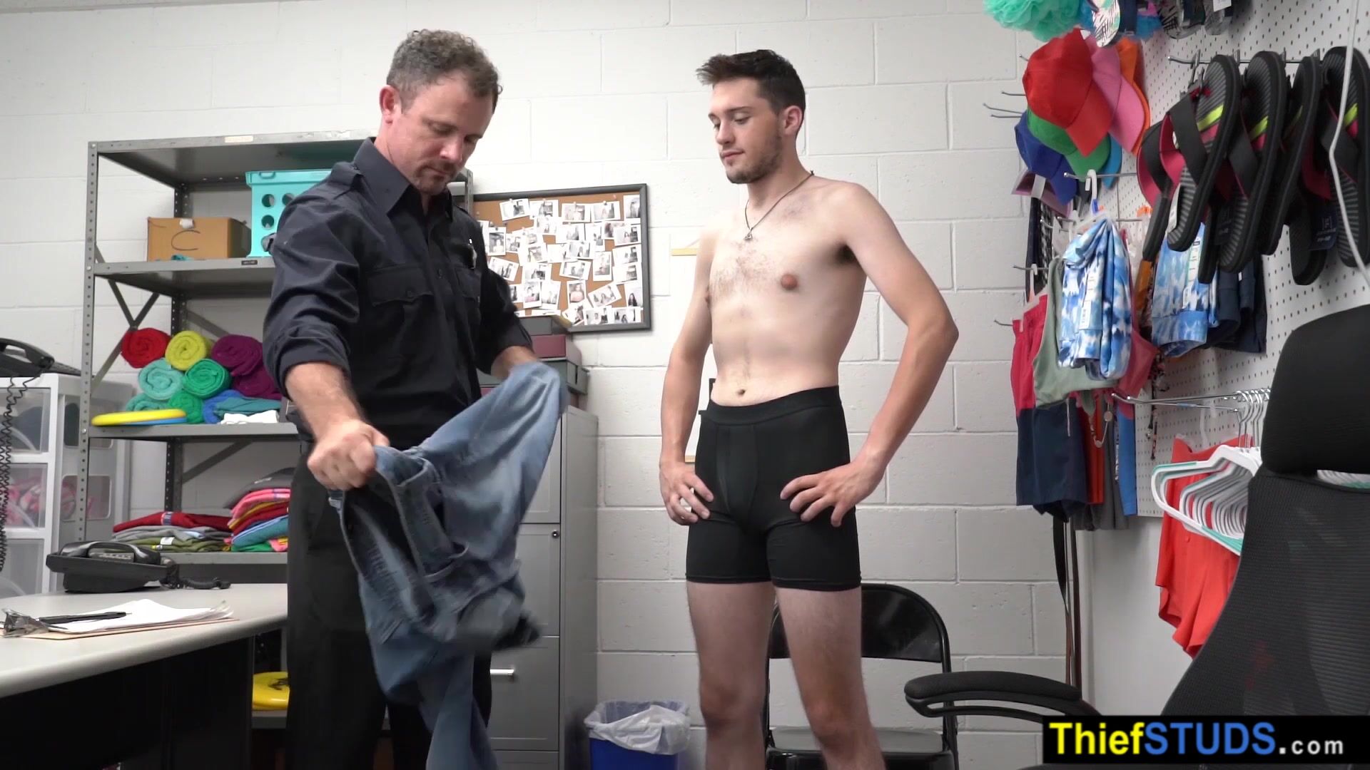 Security guard Jesse Zeppelin brings teen perp to the back office for questioning He stripping him then he anal fucking him bareback in doggystyle to teach him the rules but first the teen has to give a deepthroat blowjob to the big cocked guard