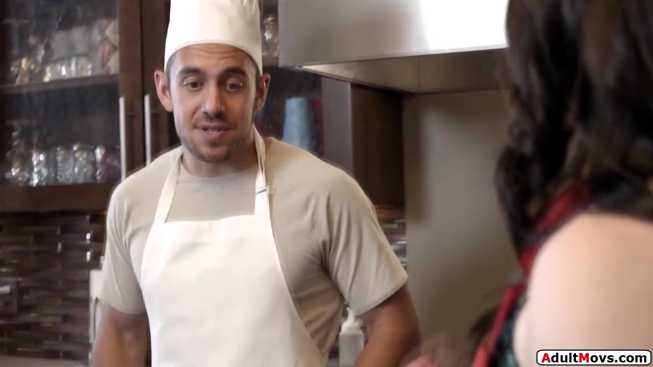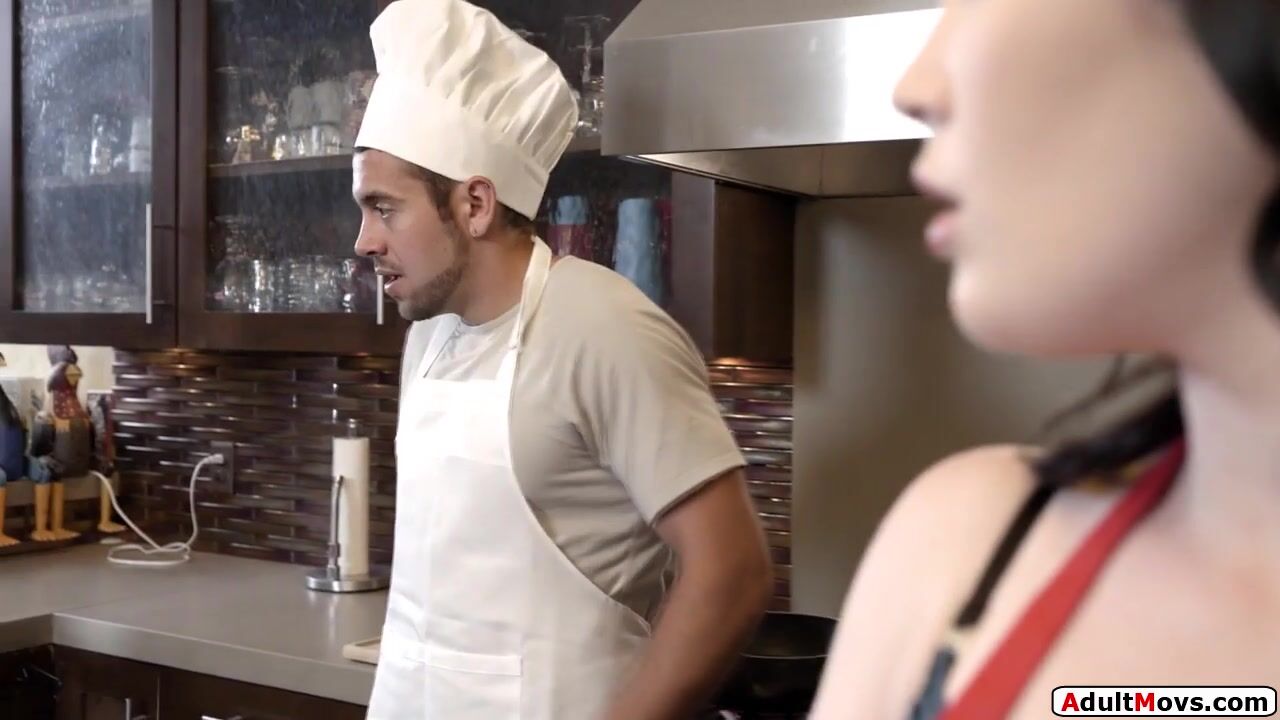Brunette babe and chef flirt.When hes gone to get some she fucks a zucchini and is caught masturbating.The small tits babe drops her apron and kisses him.She gets her pussy licked and is facefucked.He rubs his big cock on her snatch and fucks her
