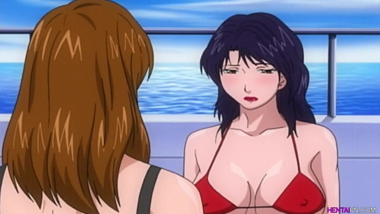 While suntanning her massive tits another topless passenger came to rub nipples with her