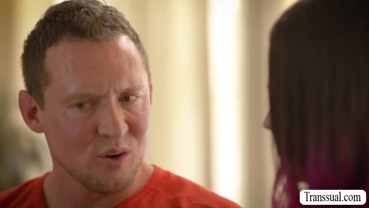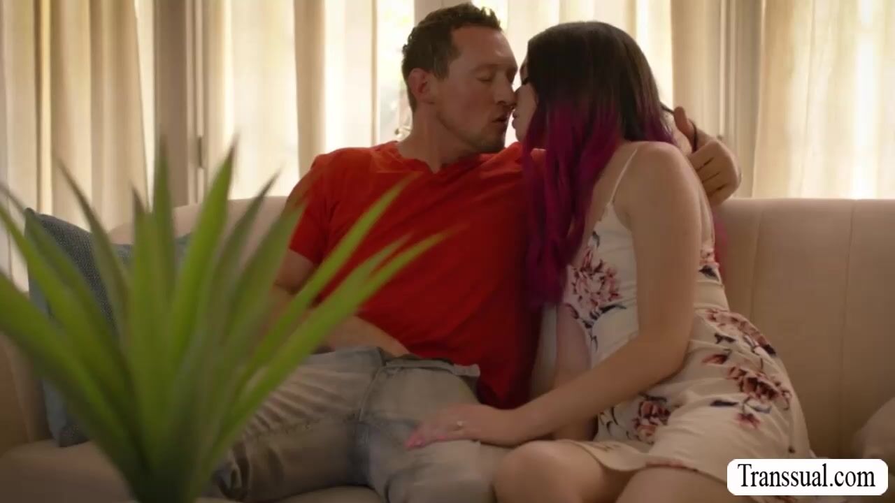 Small tits and pale shemale Natalie Stone is with her horny stepbro.The redhead tranny and the dude exchange kisses.The trans babe deepthroat blowjobs his cock on the couch.The guy bareback anal fucks her tight asshole in several positions.