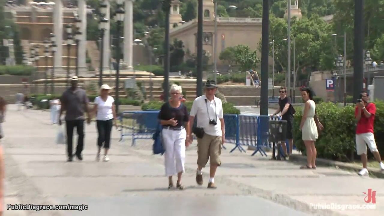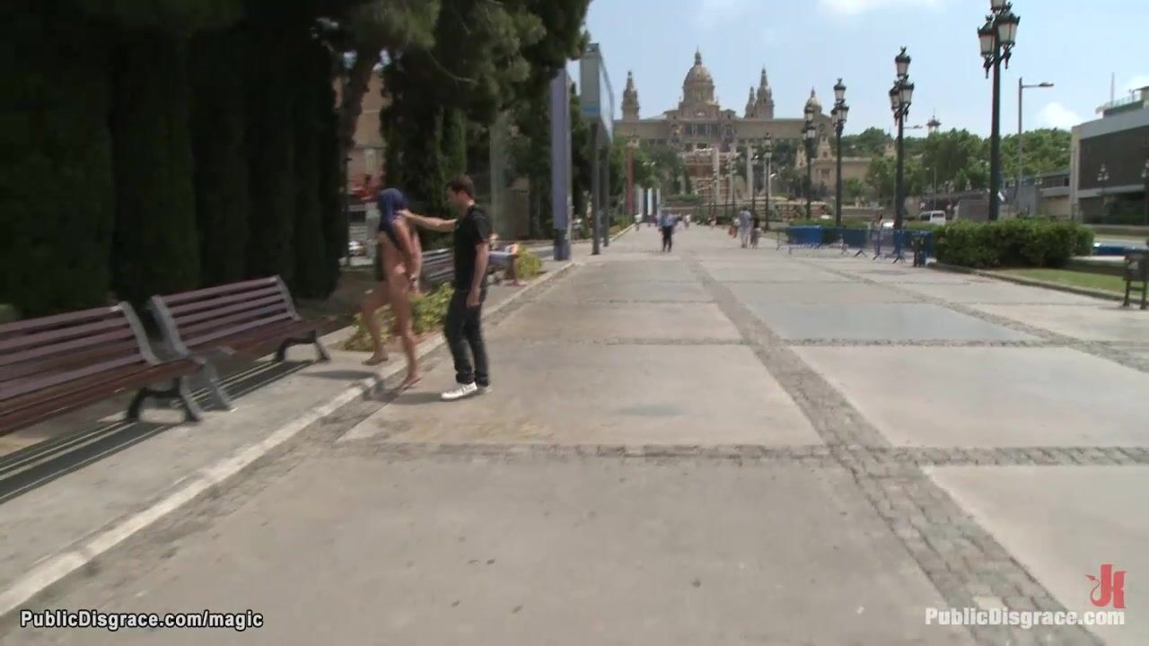 Naked and barefoot Spanish babe Sara May with dress pulled over head walked and humiliated in public streets then anal fucked by master with huge dick James Deen