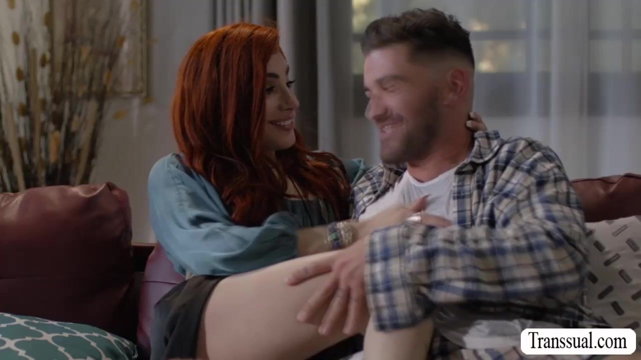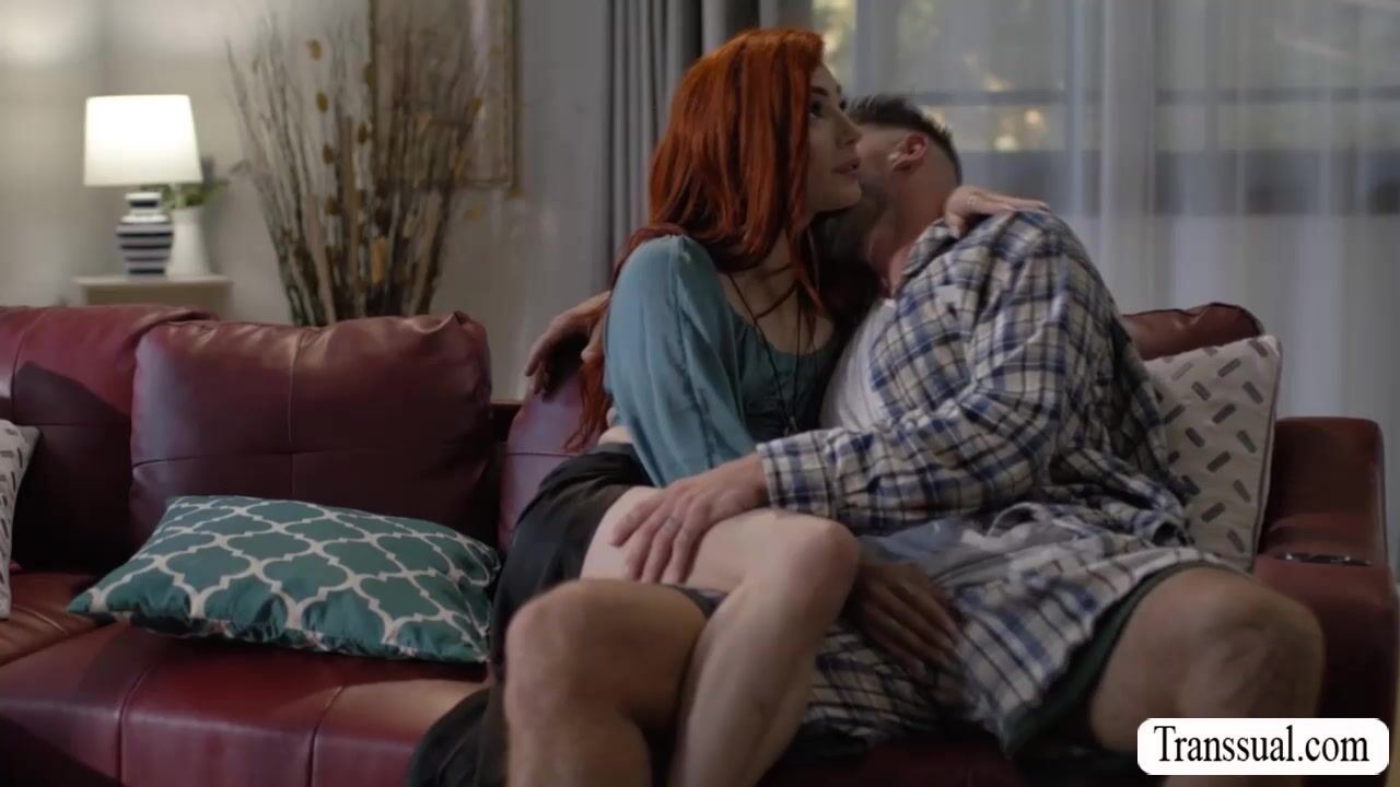 Redhead tranny babe and her new guy are kissing each other after they arrive in the house.Next is,they sit on the couch and she then throats the big cock of the guy passionately.In return,the guy bareback fucks her tight wet ass so deep and hard.