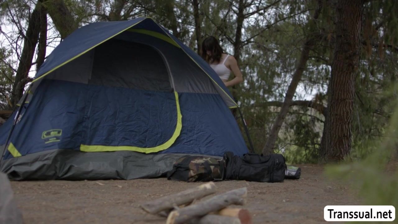 Slut babe is toying her wet pussy inside the tent and a big cock shows up in the hole.After that,she throats it passionately and her shemale bestfriend arrives and joins sucking the big cock of random guy.In return,the dude bareback the ass of TS.