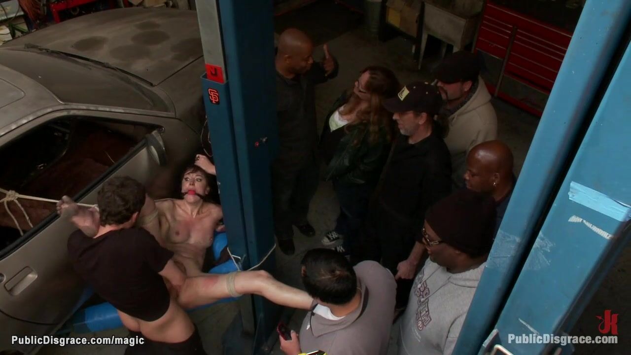 James Deen drags hot brunette Emo babe Coral Aorta in local public auto body shop then binds and fucks her with huge cock in front of strangers