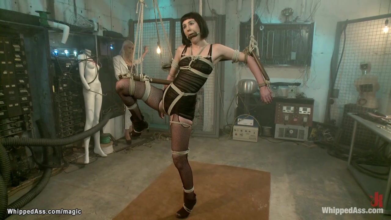 Bound and gagged brunette lesbian slave in lingerie and fishnets Coral Aorta gets fingered and whipped then fucked by blonde lezdom Lorelei Lee