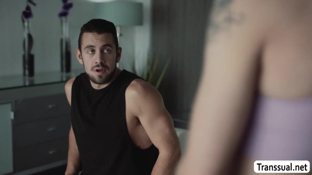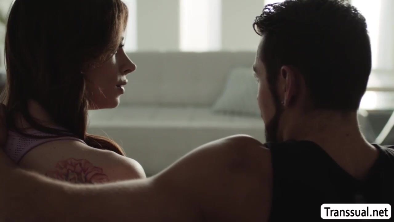Slut trans woman shows her nice tits to the friend of her boyfriend.After that,they start kissing each other on the couch and she then throats his hard big cock passionately.In return,the dude bareback fucks her wet ass so hard.