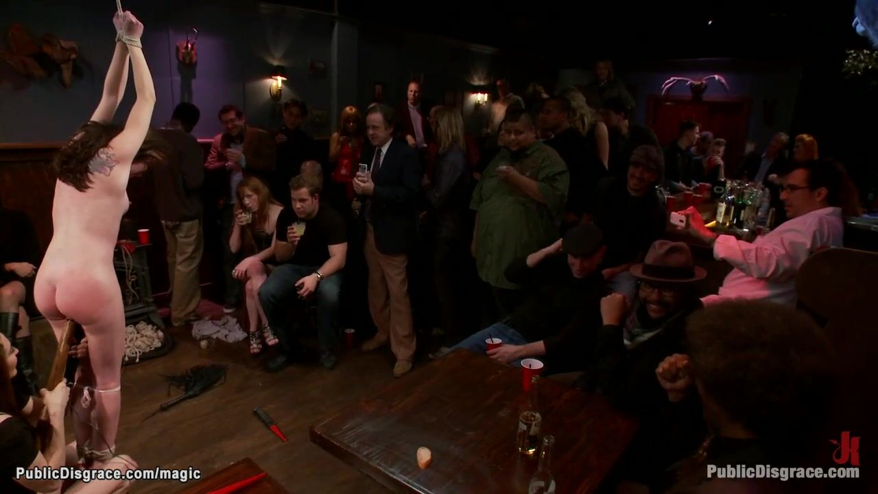 Slim brunette slave Jessi Palmer is tied and zippered then pussy fisted by Princess Donna Dolore then fucked by big dick James Deen in public crowded place