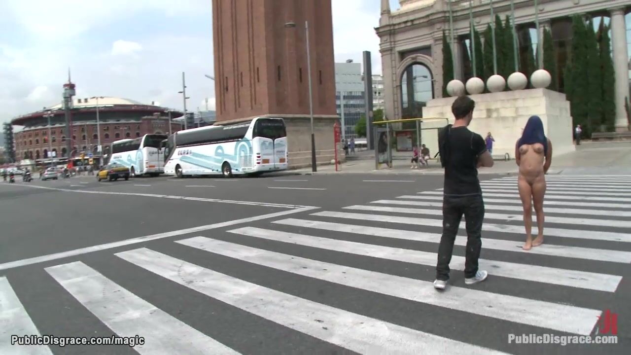 Handcuffed naked European slave Sara May is walked barefoot in public street by master James Deen then anal fucked and hair cummed in the park